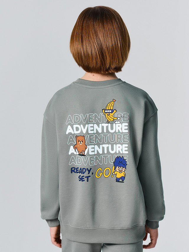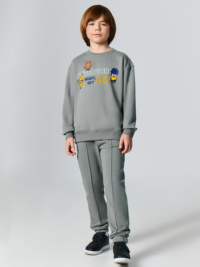 Комплект в универсальном сером оттенке — для мальчиков, которые всегда в движении. Надпись «Приключение. На старт, внимание, марш!» превращает вещь в энергичный призыв к новым открытиям и командным играм.