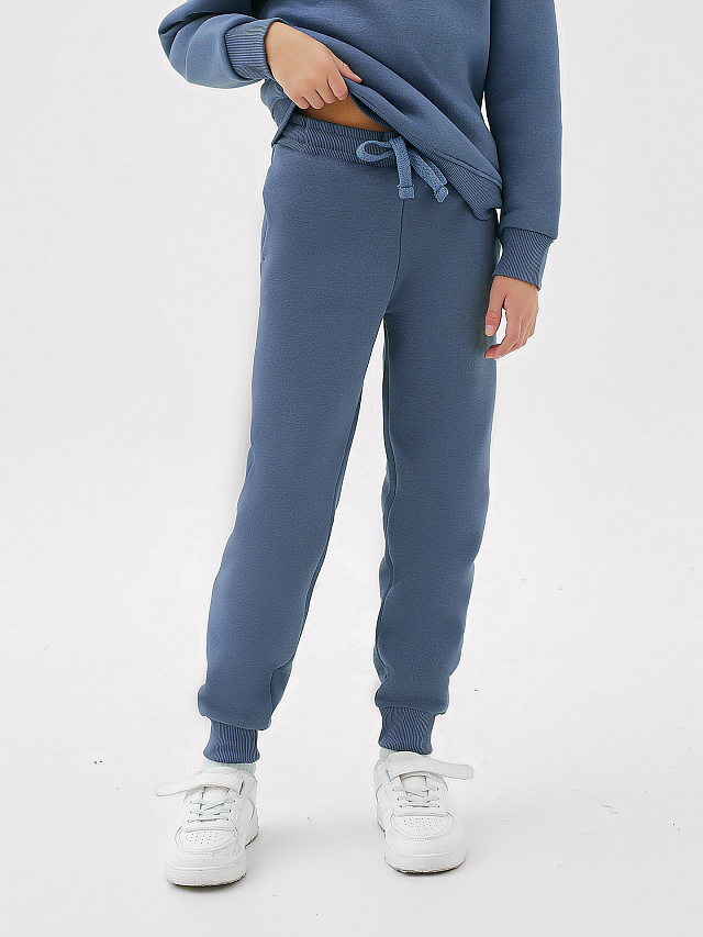 Брюки свободного силуэта. Пояс отрезной из рибаны с резиной внутри, по поясу проложены 2 отделочные строчки, по центру пробиты петли для шнура.