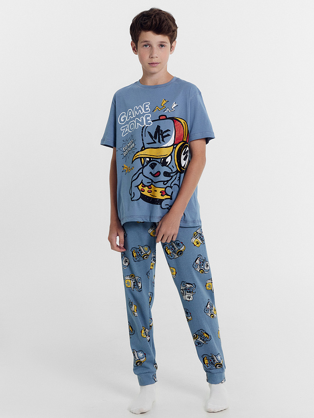 Комплект для мальчиков (футболка, брюки) серо-синий с принтом "геймеры"
