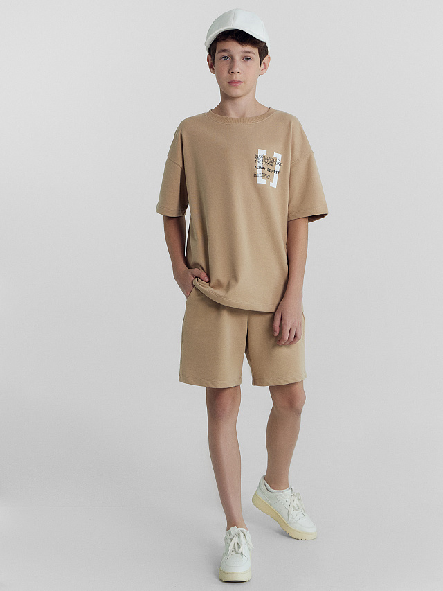 Комплект для мальчиков (футболка, шорты) бежевый с печатью