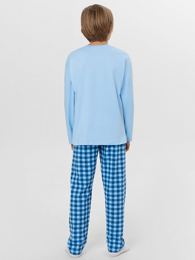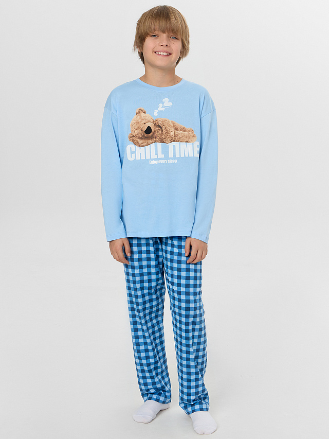 Голубая пижама для мальчиков с принтом и надписью создает атмосферу спокойного отдыха. Надпись «Время расслабляться. Наслаждайся каждым сном» передает философию здорового отдыха и напоминает о ценности качественного сна.