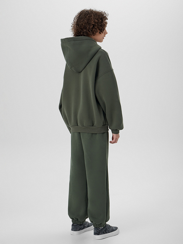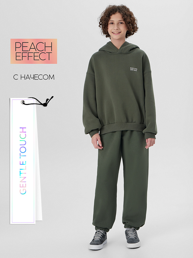 Худи для мальчиков, свободного силуэта (оверсайз), с капюшоном. Горловина округлой формы. Капюшон со средним швом, на подкладке из основного полотна. Плечо спущено, рукав втачной длинный. Боковые швы перенесены вперед. По низу рукава отрезная манжета из рибаны.