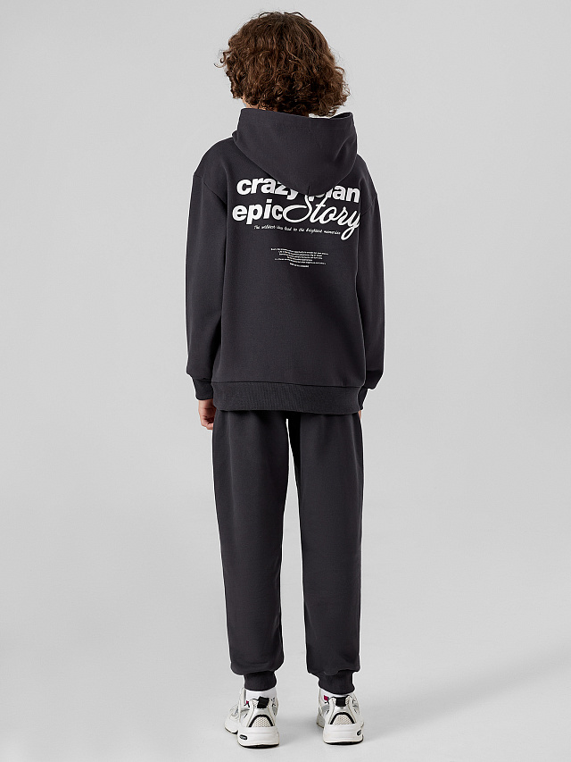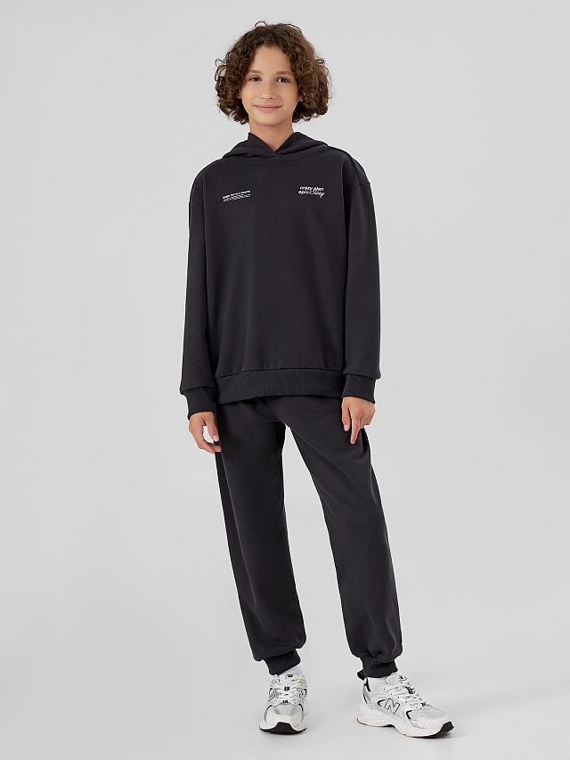 Худи свободного силуэта для мальчиков с капюшоном. Горловина округлой формы. Капюшон со средним швом, на подкладке из основного полотна. Плечо спущено, рукав втачной длинный. По низу рукава отрезная манжета из рибаны. Пояс отрезной из рибаны.Брюки для мальчиков. Без бокового шва. Карманы в вытачке. Пояс отрезной с внутренней эластичной тесьмой. Пояс прострочен двумя отделочными строчками. Внутри в пояс втянут шнур. Низ брюк обработан манжетами из рибаны.