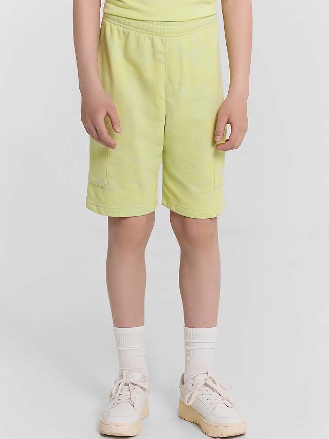 Шорты прямого силуэта. Пояс отрезной с эластичной тесьмой внутри. По поясу проложены две декоративные строчки, внутри пробиты петли и втянута х/б тесьма. По переду имитация гульфика. На деталях переда накладные карманы. Низ изделия обработан швом в подгибку.