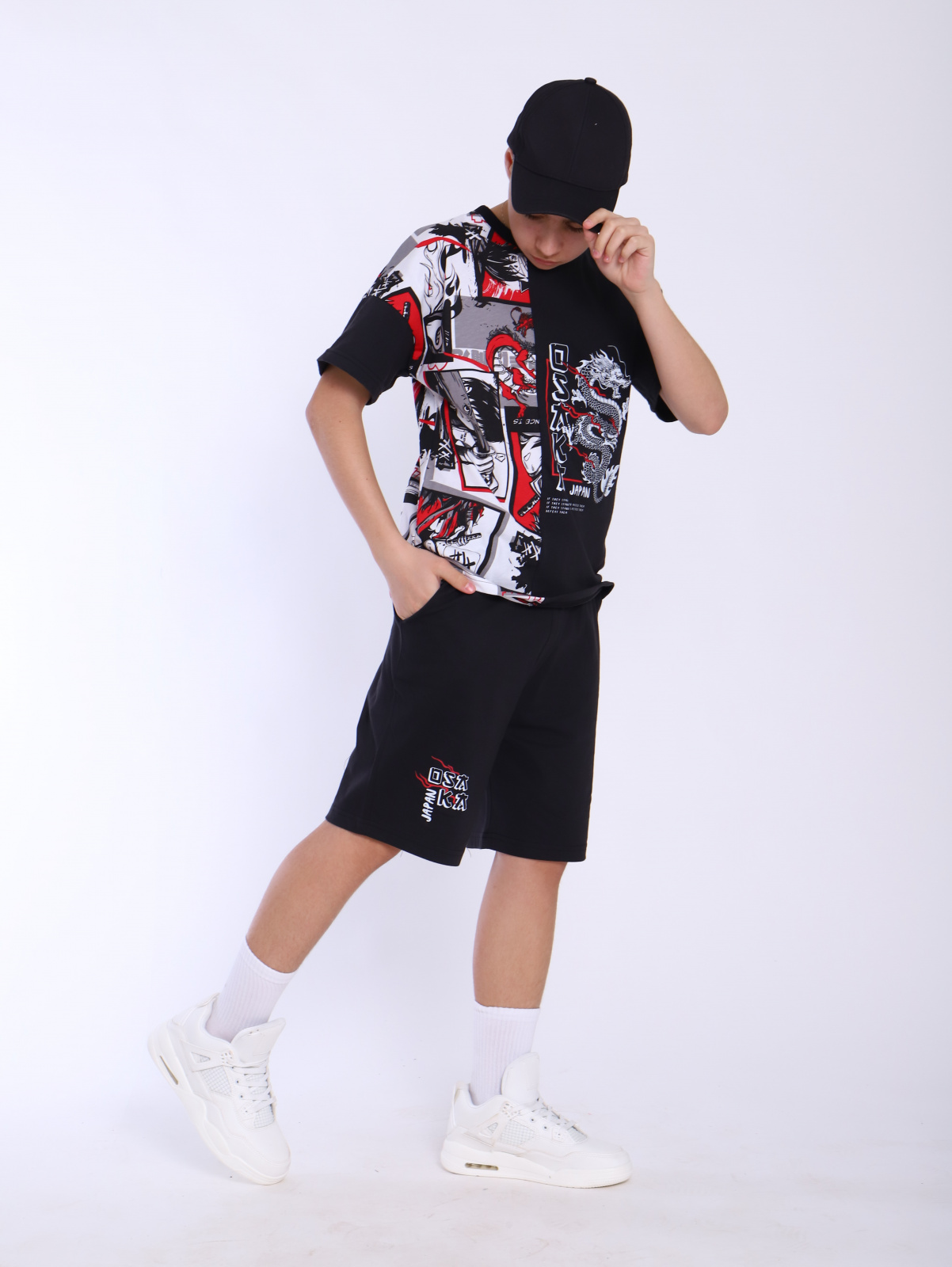 Легкий натуральный комплект на мальчика в сшит из хлопкового трикотажа. Костюм летний состоит из футболки и шорт-бридж чуть длиннее колена. Легкий, немаркий, удобный для активных подростков костюм с футболкой позволяет ребенку бегать, прыгать и чувствовать себя комфортно на улице и дома! Костюм подходит для прогулок на свежем воздухе, для активных спортивных игр, для катания на велосипеде. В поездке на отдых к морю или в детский лагерь удобно его одеть в дорогу . Натуральный хлопковый состав дает возможность телу дышать, мальчик чувствует комфорт и удобство. Комплект с удовольствием носят дома как домашнюю одежду. Комплект для летнего отдыха может служить спортивной формой для футбола или волейбола. Цвет костюма практичный и немаркий. Костюм подростковый двойка с капри это отличный подарок к летнему сезону или на 23 февраля. Костюм базовый универсальный для активных подростков может служить пляжной одеждой. Чтобы детский летний костюм милитари с шортами служил долго, необходимо соблюдать рекомендации по уходу. Утюжить принт только с изнаночной стороны. Повседневный костюм используют не только летом. Он демисезонный. Зимой осенью и весной он прекрасно справляется с функциями домашнего комплекта для отдыха. Обращаем ваше внимание на то, что рисунок может располагаться как справа, так и слева.