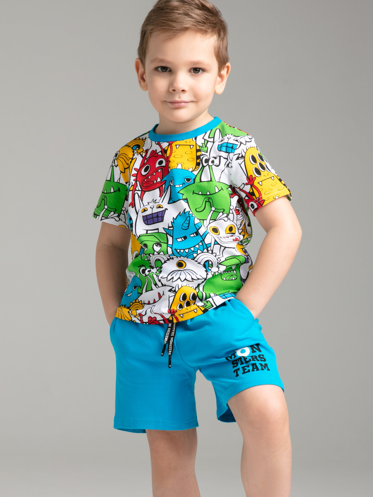 Комплект: футболка и шорты из качественного эластичного и приятного на ощупь трикотажа. Эластичный пояс со шнурком. Посадка regular fit – классический крой. Высокое содержание хлопка 95%. Благодаря наличию эластана в составе ткани изделие держит форму и меньше мнется.
