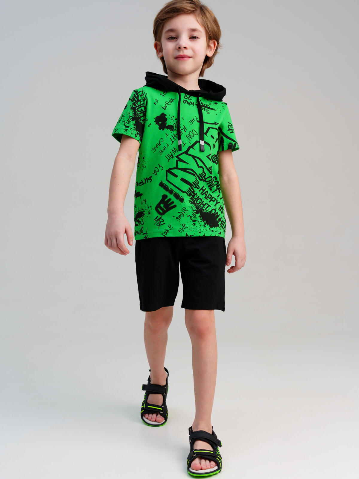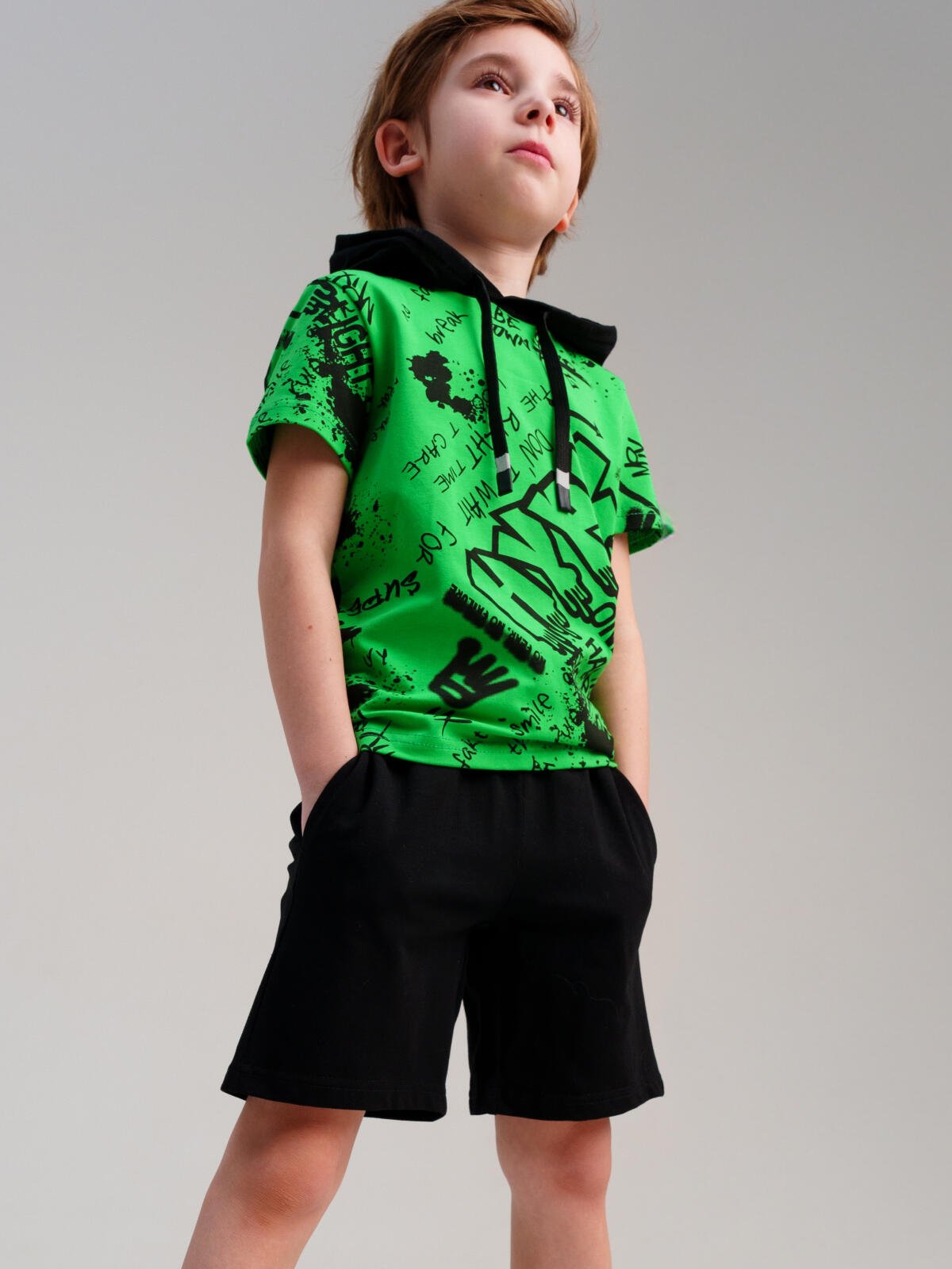 Костюм детский для мальчика. Комплект: футболка, шорты. Футболка с капюшоном с утяжкой шнурком. Шорты на резинке со шнурком. Функциональные боковые карманы. Высокое содержание хлопка. Благодаря наличию эластана в составе ткани изделие держит форму и меньше мнется. Модель выполнена из качественного и приятного на ощупь трикотажа.