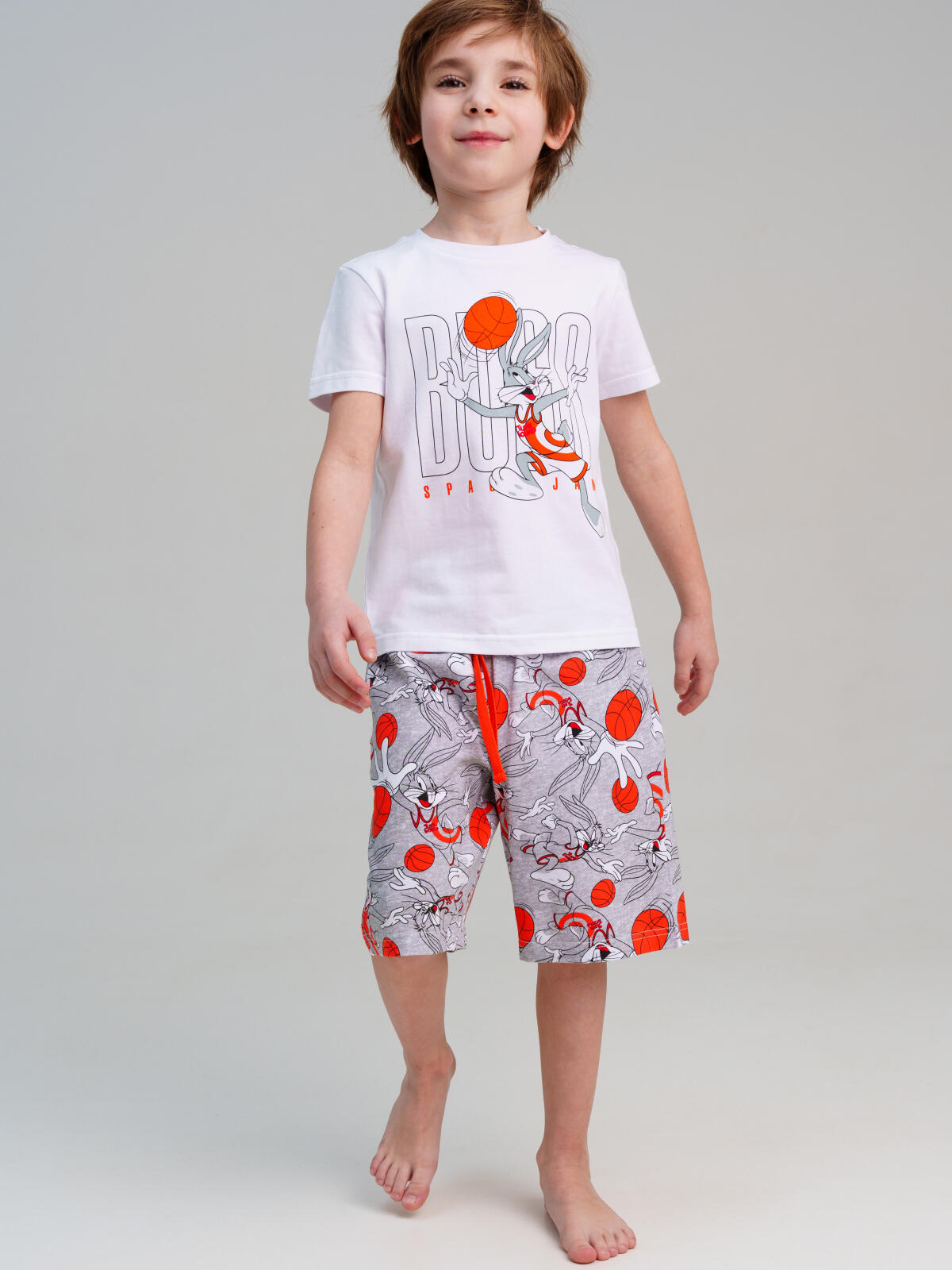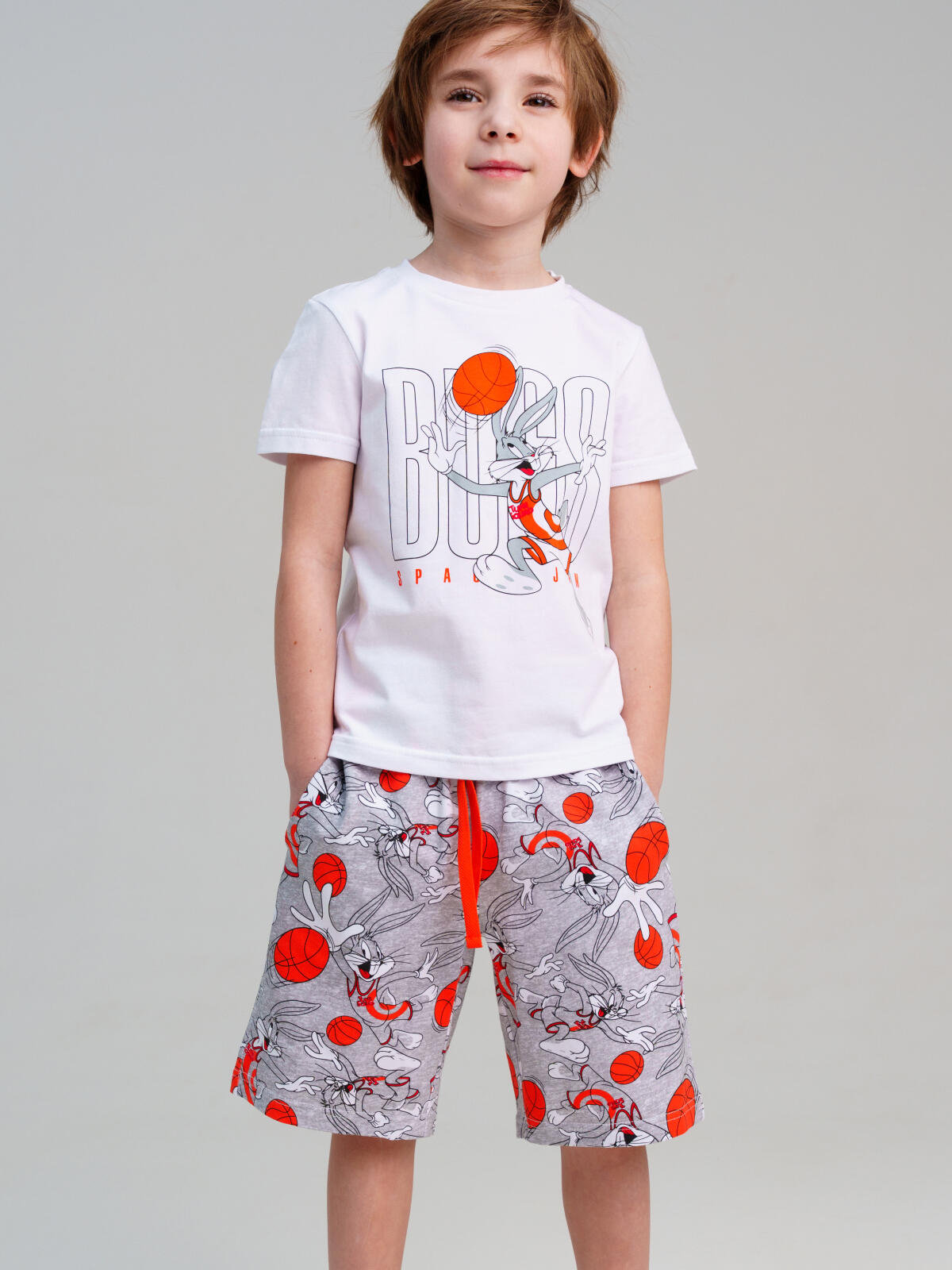 Костюм детский для мальчика. Футболка и шорты из эластичного и приятного на ощупь трикотажа. Шорты на резинке со шнурком. Высокое содержание хлопка 95%. Благодаря наличию эластана в составе ткани изделие держит форму и меньше мнется.