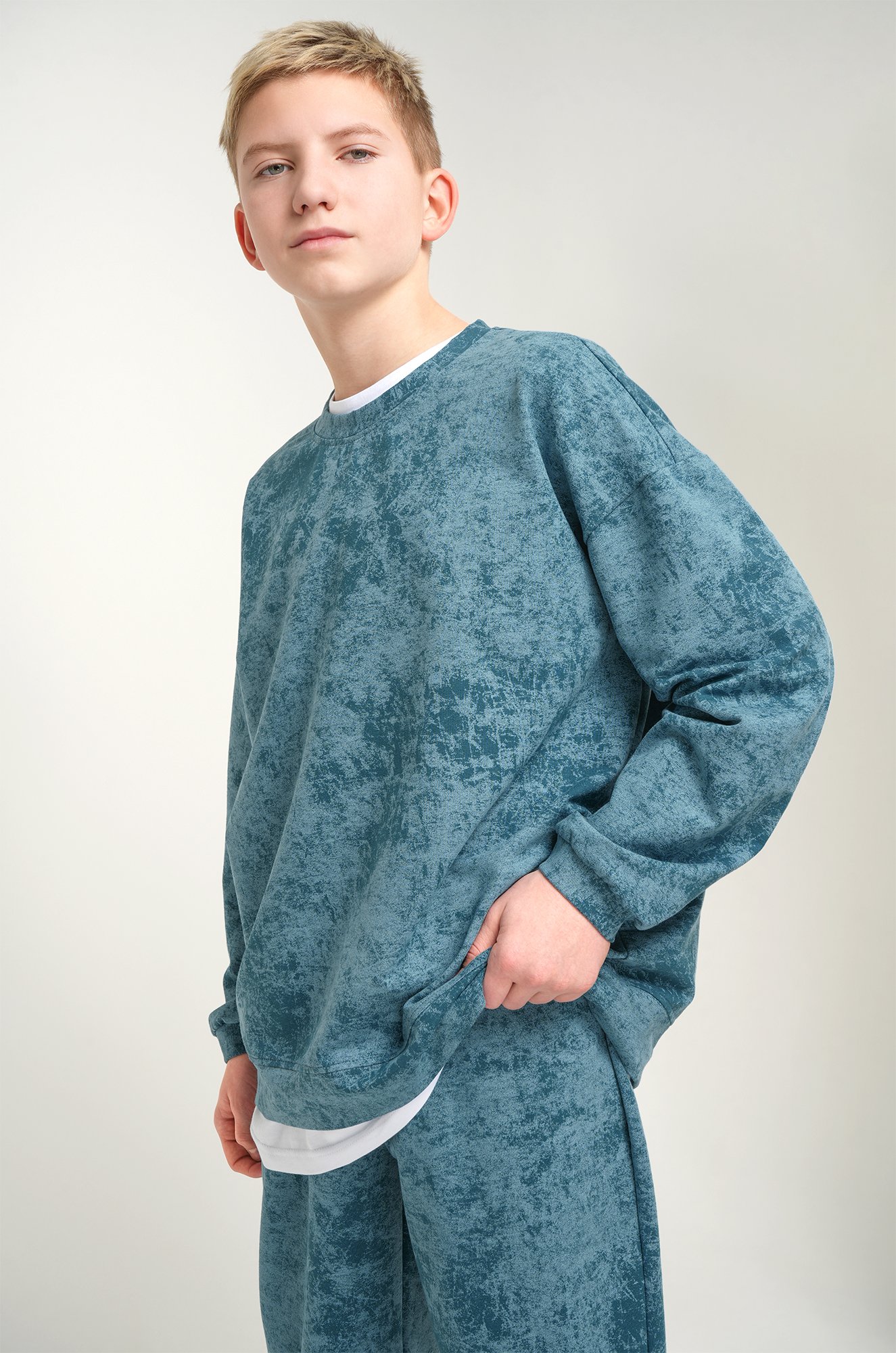 Стильный детский костюм бирюзового цвета для мальчика подростка вдохновляет на активность. Мягкая толстовка оверсайз и широкие брюки на манжетах придают полную свободу движений.