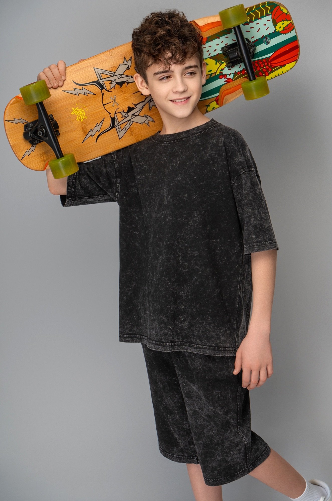 Летний костюм с шортами — универсальное решение на каждый день. Спортивный костюм для мальчика состоит из футболки оверсайз и удлинённых шорт. Вареный костюм для детей и подростков выполнен из 100% хлопка.