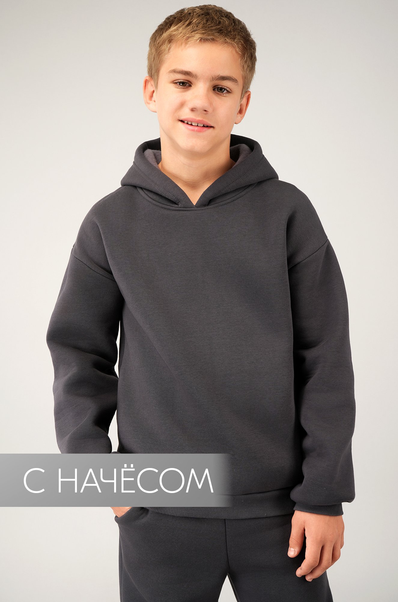 — плотный трикотаж футер с начесом надежно сохраняет тепло (плотность 330 г/м2);