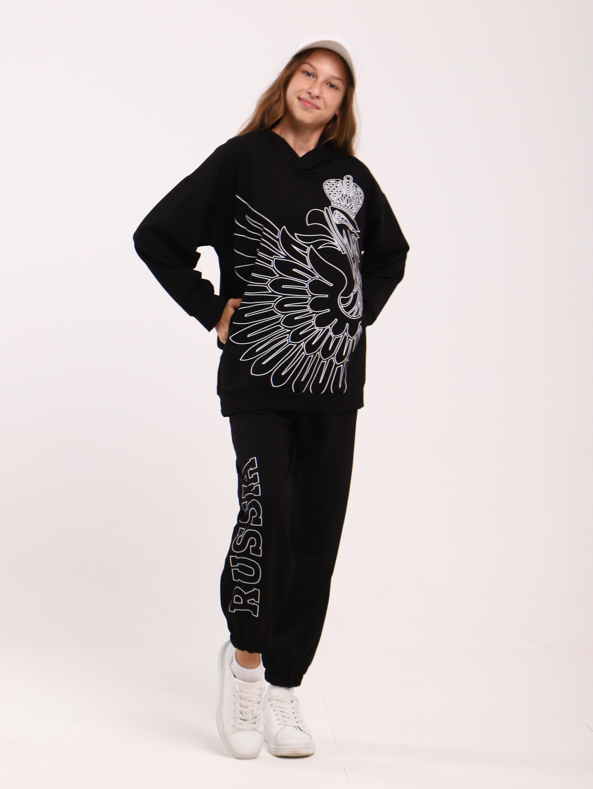 Наши спортивные костюмы - настоящий must have для повседневной моды, спорта и уроков физкультуры в школе для современных подростков. На молнии и с толстовкой худи, однотонные и с большим контурным принтом . Удобная толстовка свободного кроя ОВЕРСАЙЗ с капюшоном, со спущенной линией плеча, с карманами в боковых швах. Рукава с манжетами. На лицевой части крупный принт в виде крыла орла (символика России (РФ), в задней части вертикальная надпись «RUSSIA». Брюки модного широкого кроя с завышенной талией, но заниженной посадкой, пояс на удобной простроченной резинке с регулировочным шнуром, низ брюк на резинке. На правой ноге крупный принт «RUSSIA». Спортивный костюм выполнен из облегченного комфортного материала футера двухнитки с повышенным содержанием хлопка и лайкрой для удобства и эластичности. Изделия в комплекте могут использоваться как самостоятельные модные предметы одежды. Стильный трикотажный комплект двойка предназначен для современных и практичных юношей и девушек. Используется в повседневной жизни и для занятий спортом. Спортивный костюм облегченный без начеса является универсальным тренировочным костюмом, который подойдет не только для спорта и фитнеса в зале, но и для тренировок на улице. Это спортивная форма для занятий физкультурой будет незаменима для бега, для активных спортивных игр и соревнований. Форма для спортивных команд. В этом подростковом костюме комфортно в поездке на отдых или детский лагерь, подойдет в качестве школьной формы, будет комфортен для прогулок весной и осенью. В походе или прогулке костюм удобен, не стесняет движений. За счет сочетания хлопка с небольшим содержанием полиэстера трикотаж не теряет форму и не дает усадку после стирки, устойчив к износу и не скатывается. Комплект одежды двойка со штанами и худи.