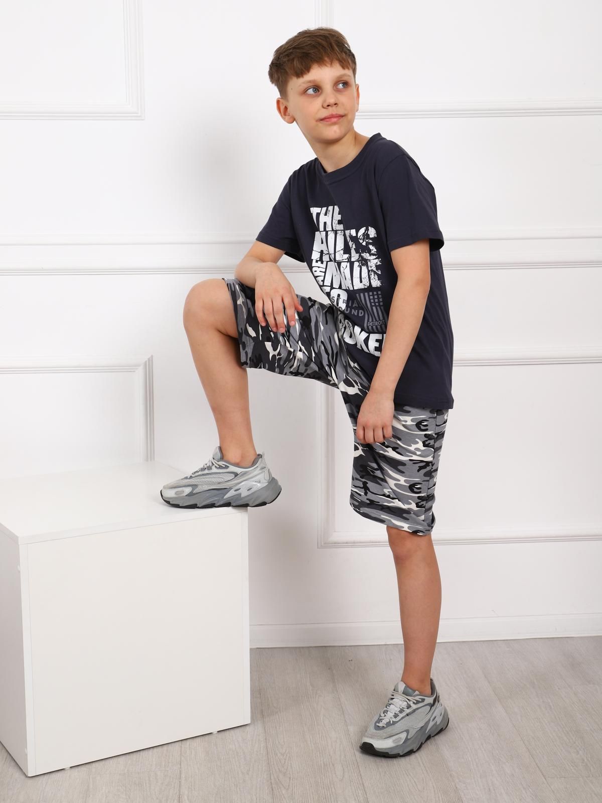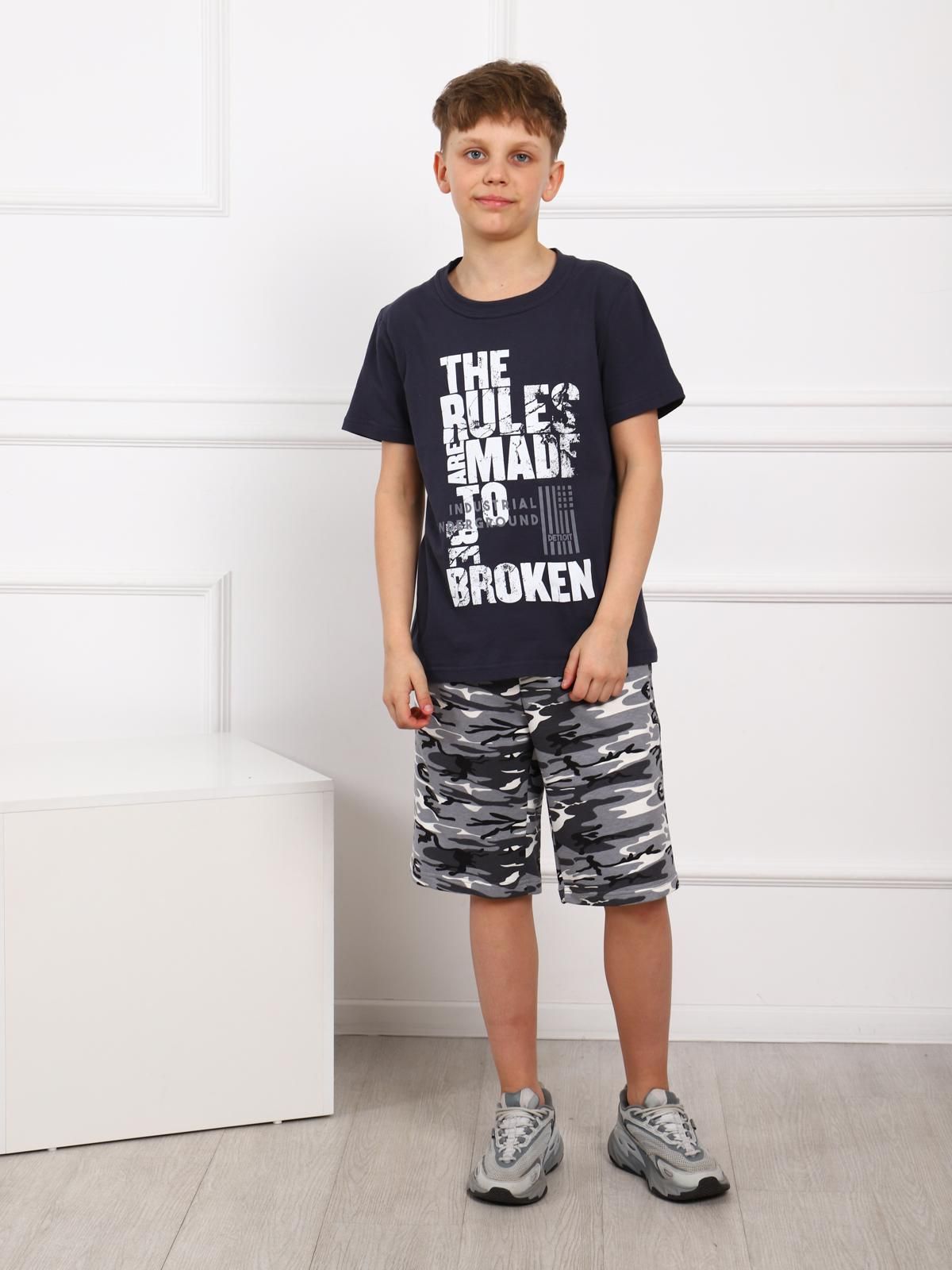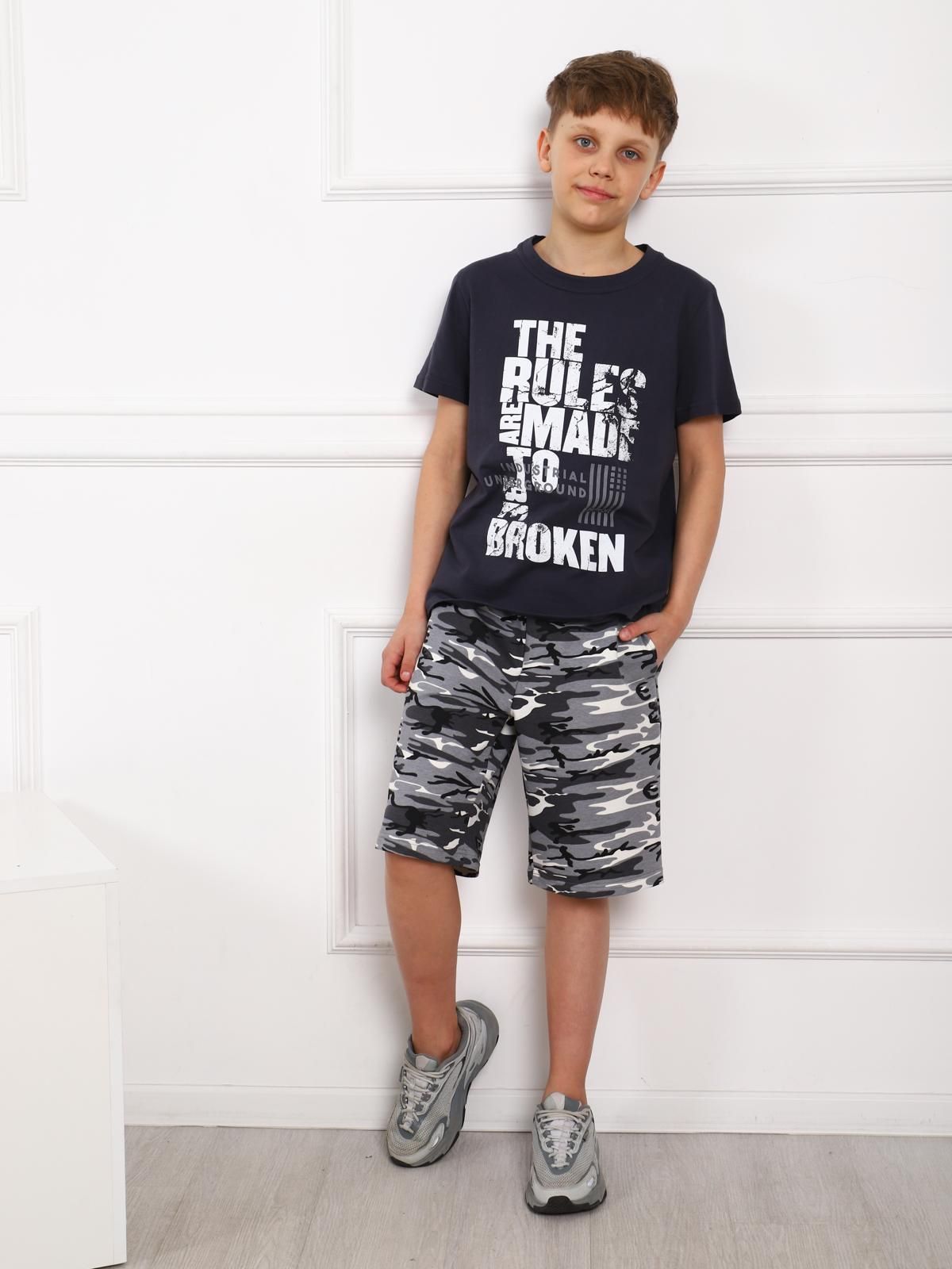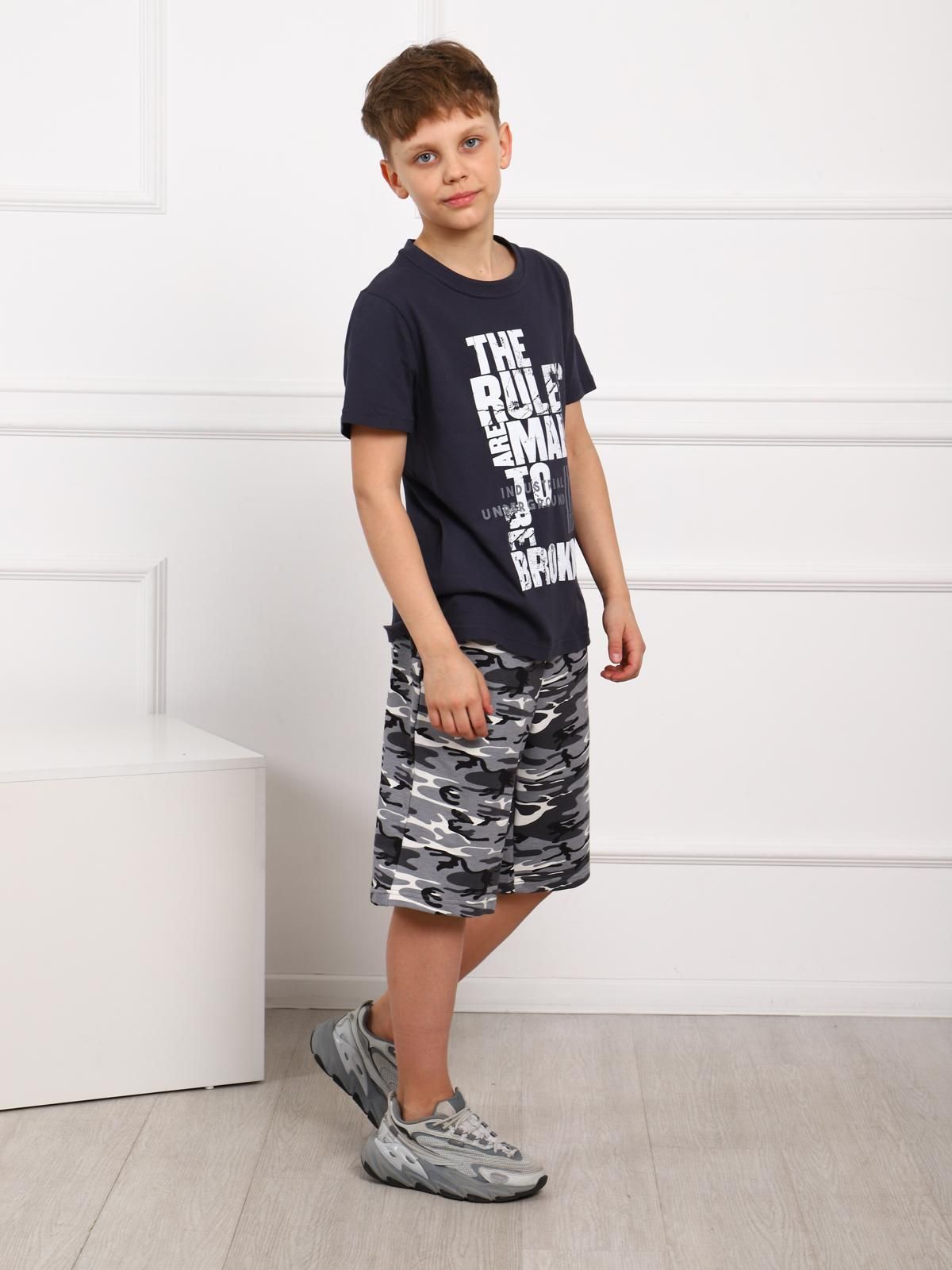 Костюм для мальчика. Футболка с втачным рукавом из однотонной ткани с крупным принтом. Удлиненные шорты из футера на поясе-резинке с карманами.
