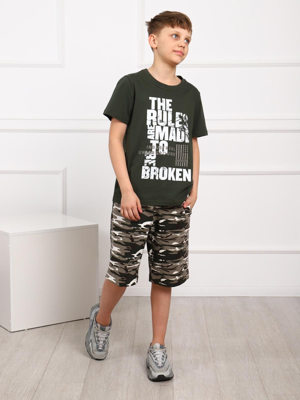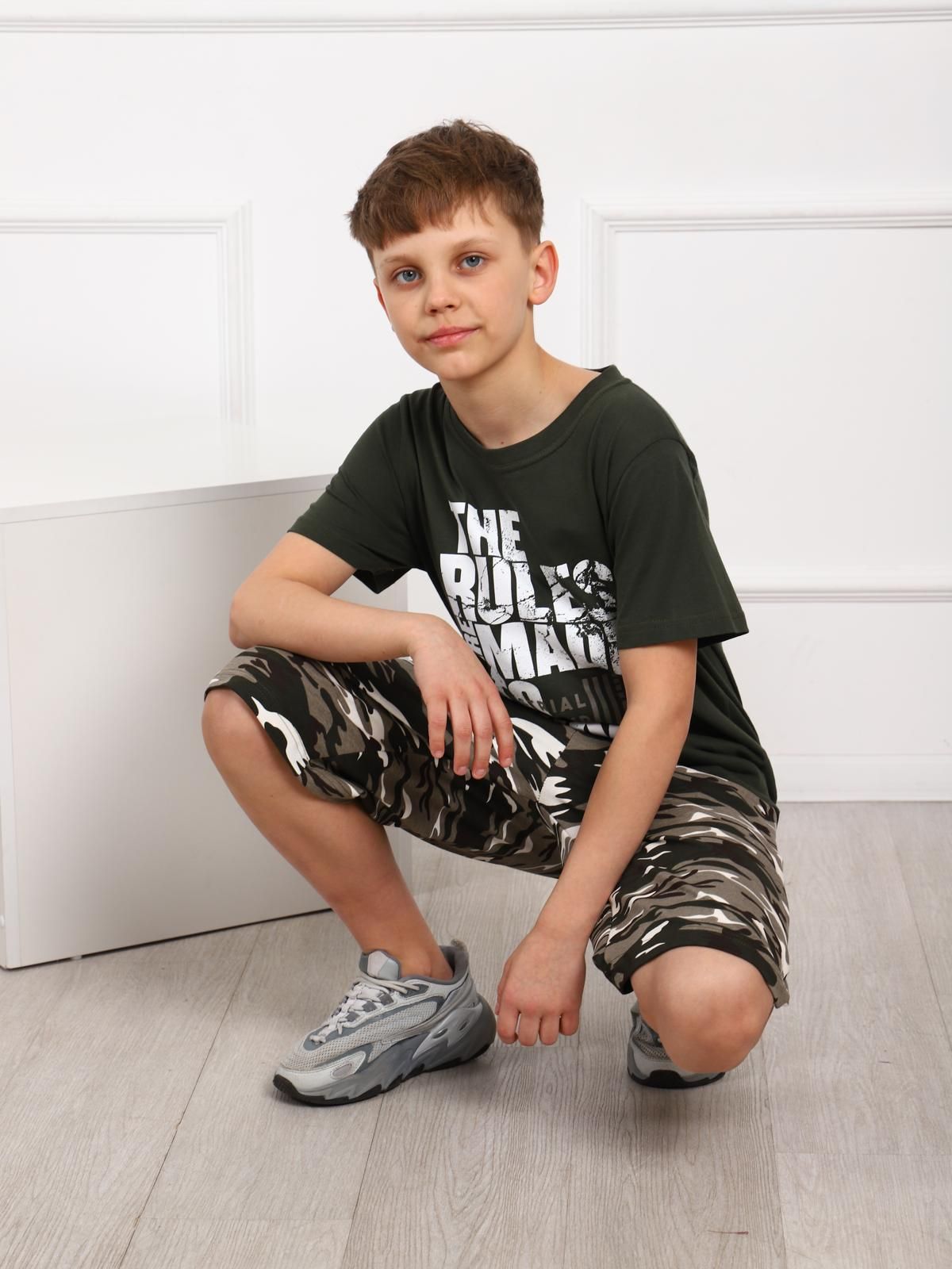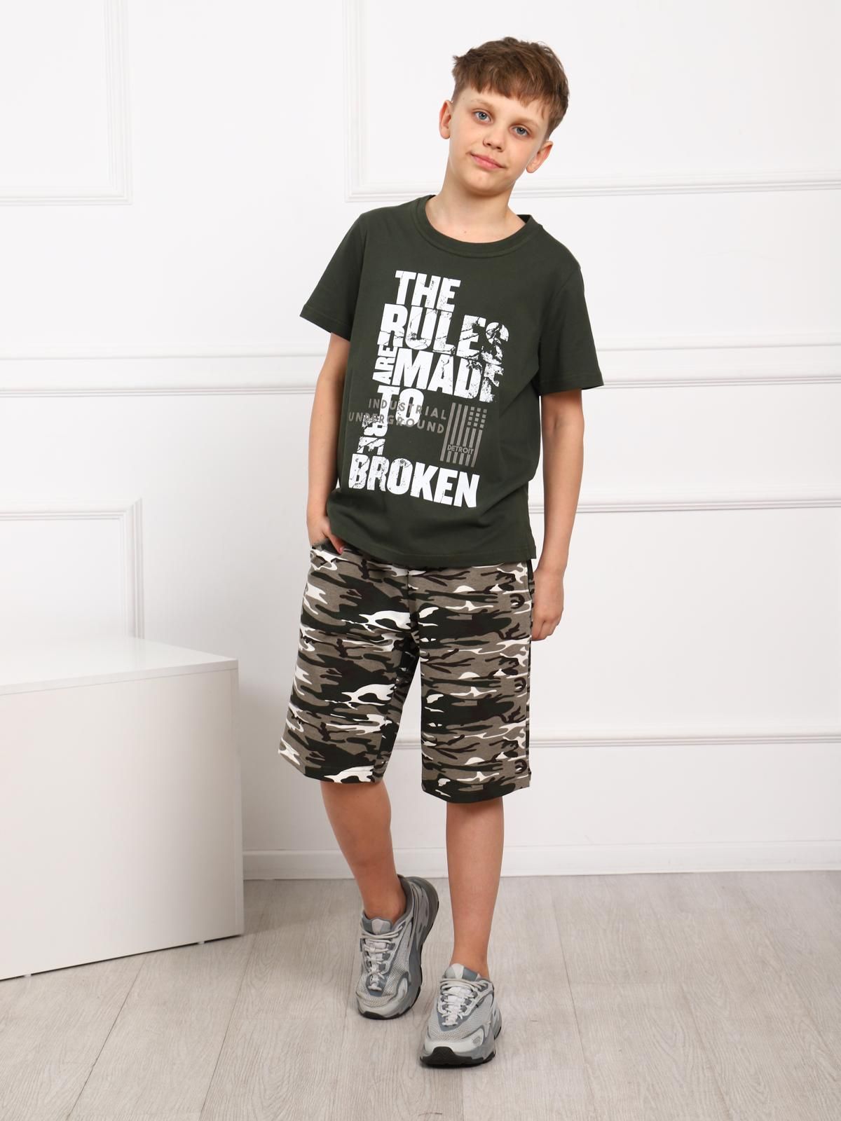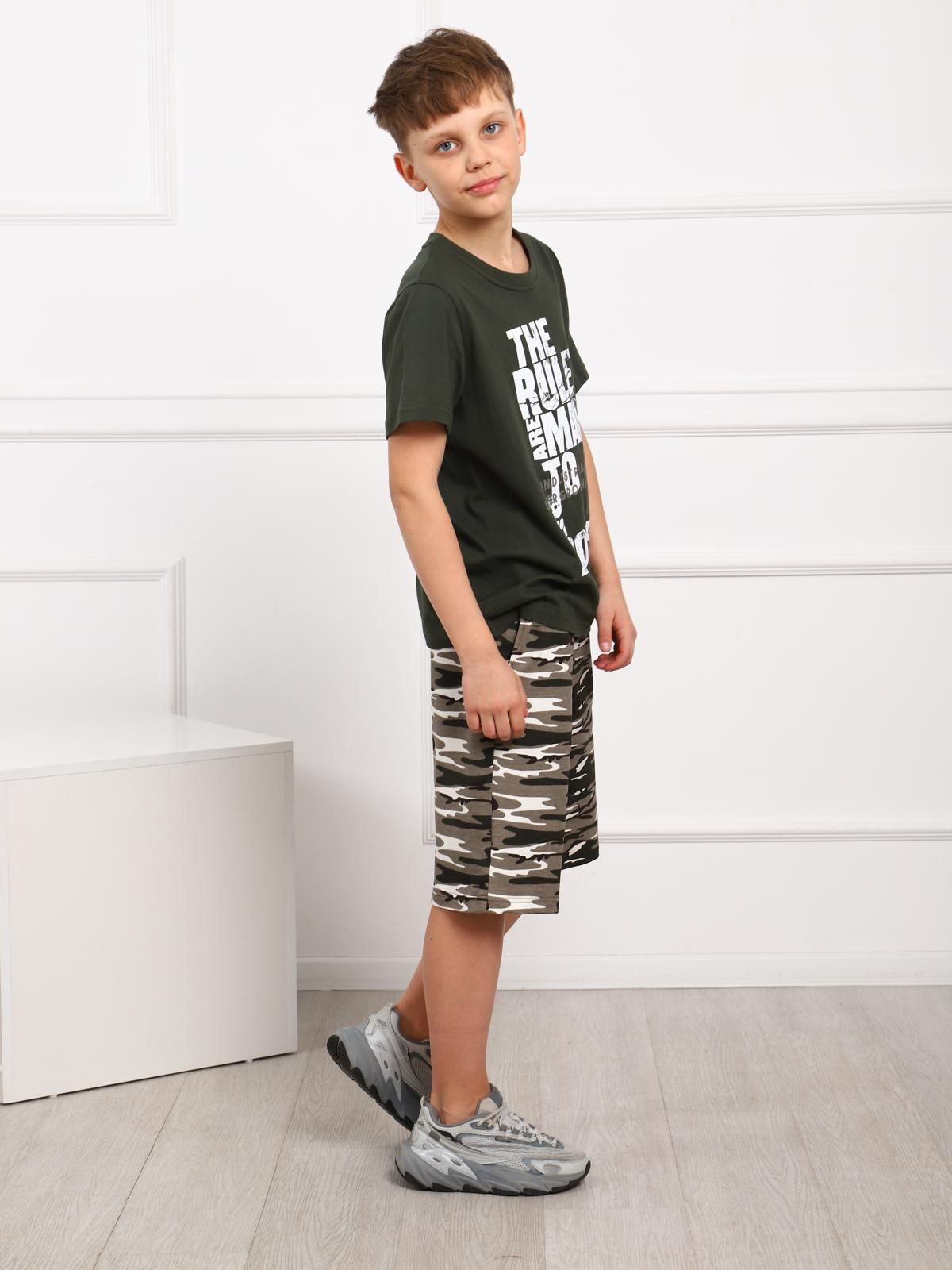 Костюм для мальчика. Футболка с втачным рукавом из однотонной ткани с крупным принтом. Удлиненные шорты из футера на поясе-резинке с карманами.