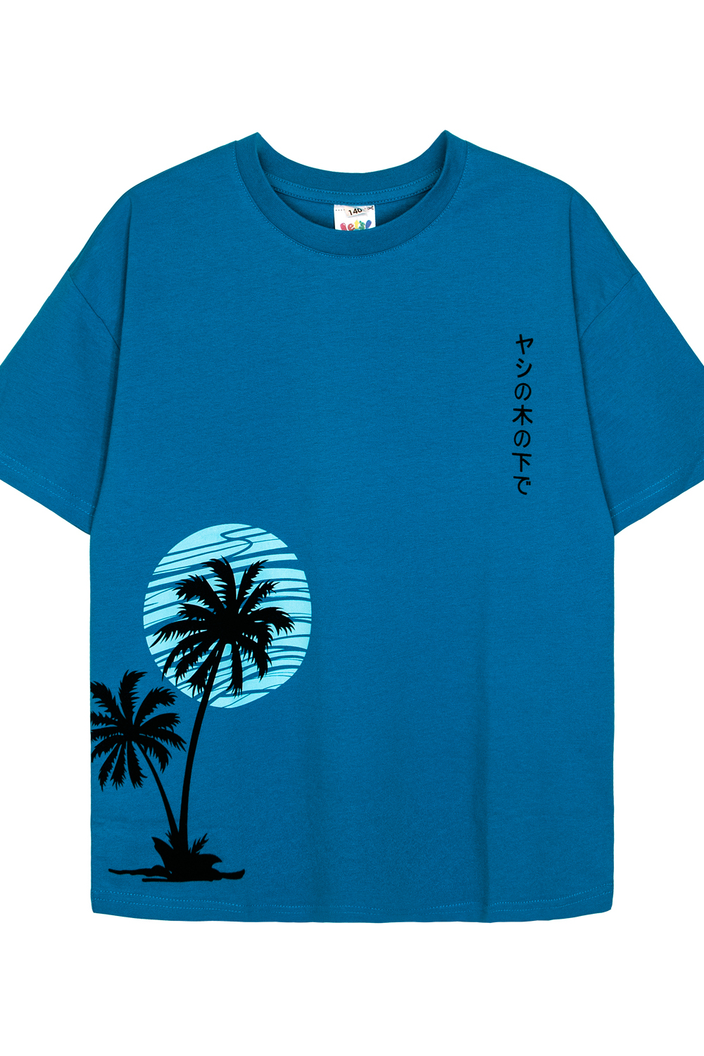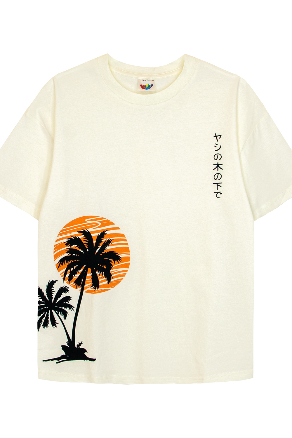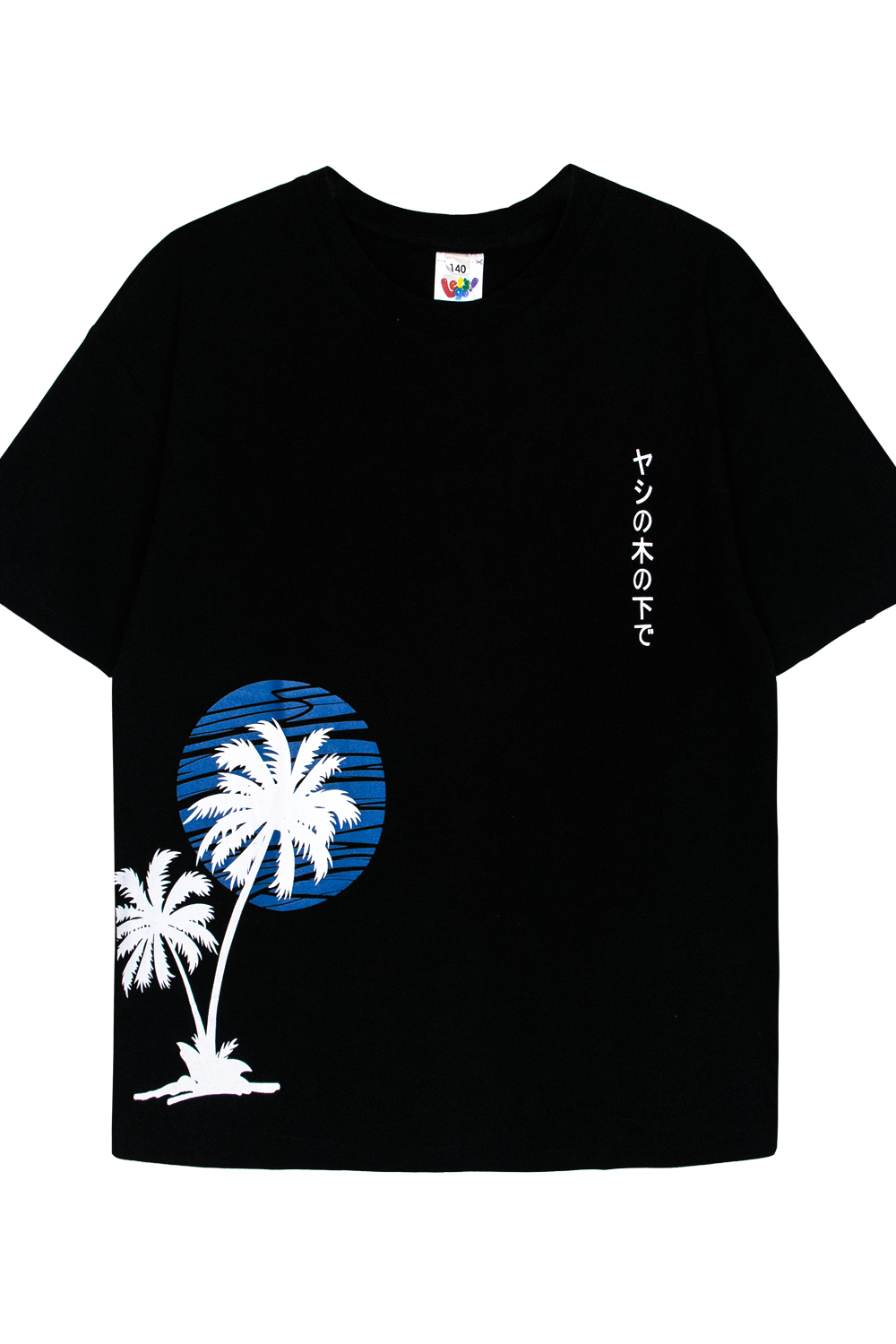 Футболка для мальчика свободного силуэта (оверсайз) с коротким рукавом. Горловина круглая, обработана воротником из рибаны. Низ изделия и рукава обработан швом вподгибку. На полочке принт шелкография. Надпись переводится как Под пальмой. Цвет: черный;молочный; Материал: кулирка;кулирка; Состав: 100% хлопок.