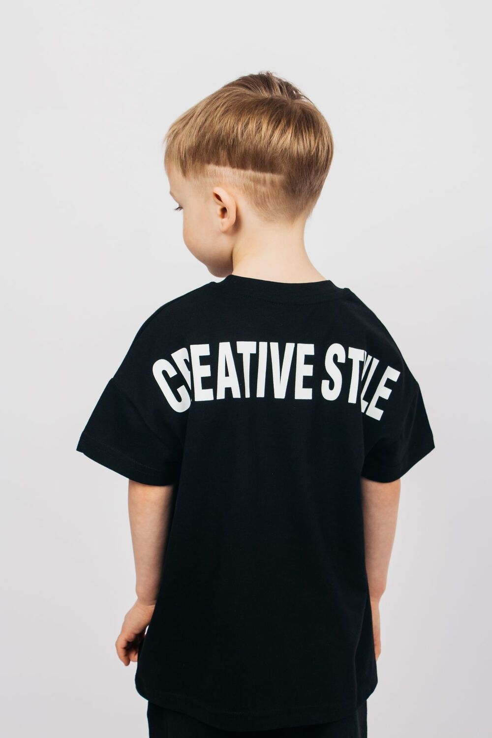 Футболка для мальчика выполнена из 100% хлопка. Футболка прямого силуэта, со спущенным плечом коротким рукавом. Благодаря эластичной горловине, выполненной из рибаны, футболку удобно снимать и надевать. На спинке принт Шелкография. Надпись переводится как Креативный стиль. Материал не растягивается и не деформируется.
