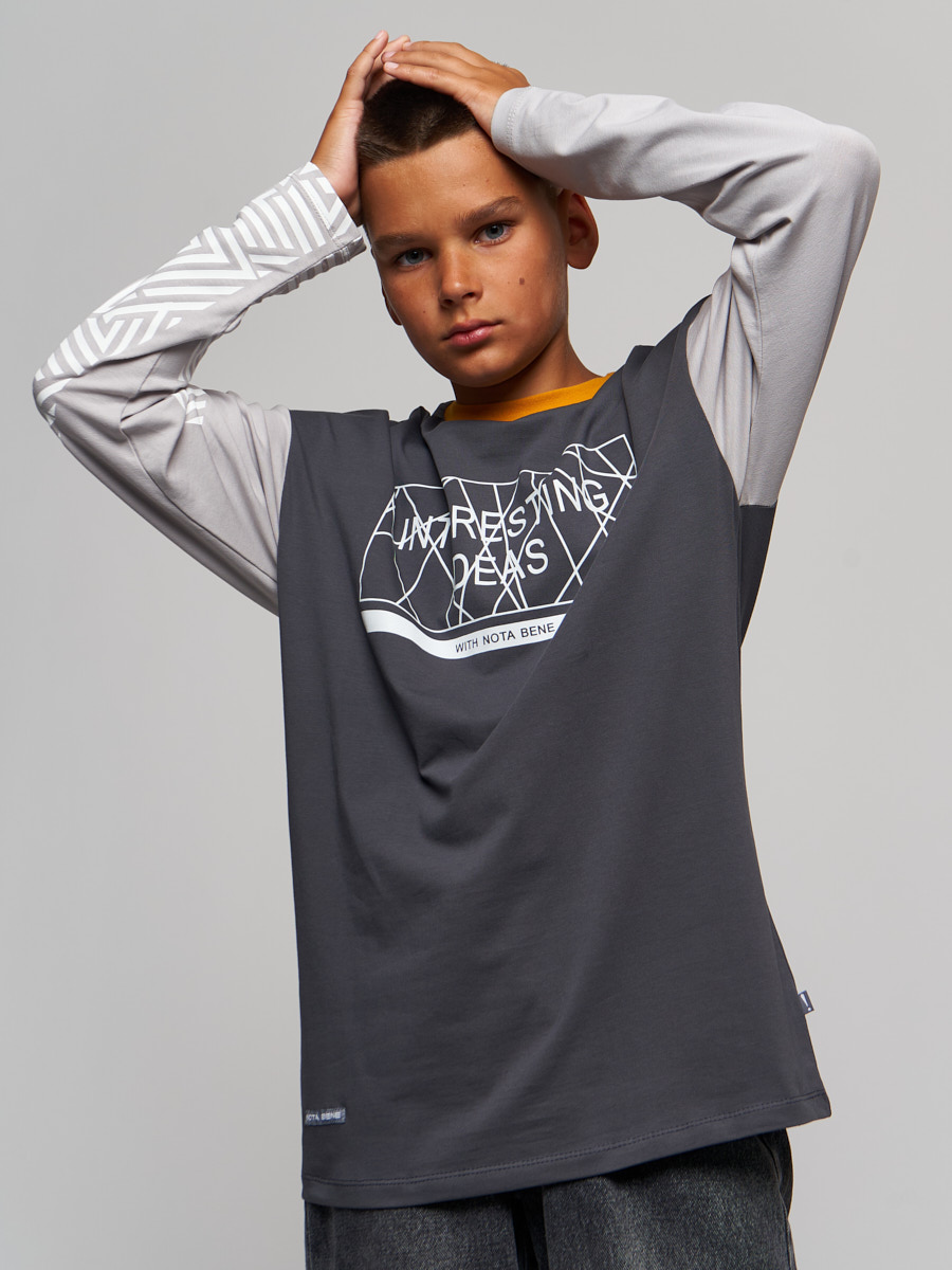 Лонгслив прямого силуэта для мальчика. На полочке и рукаве принт. Рукав втачной, длинный. Горловина обработана планкой. серый