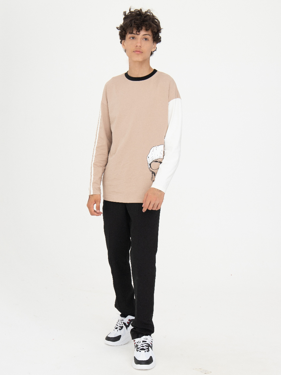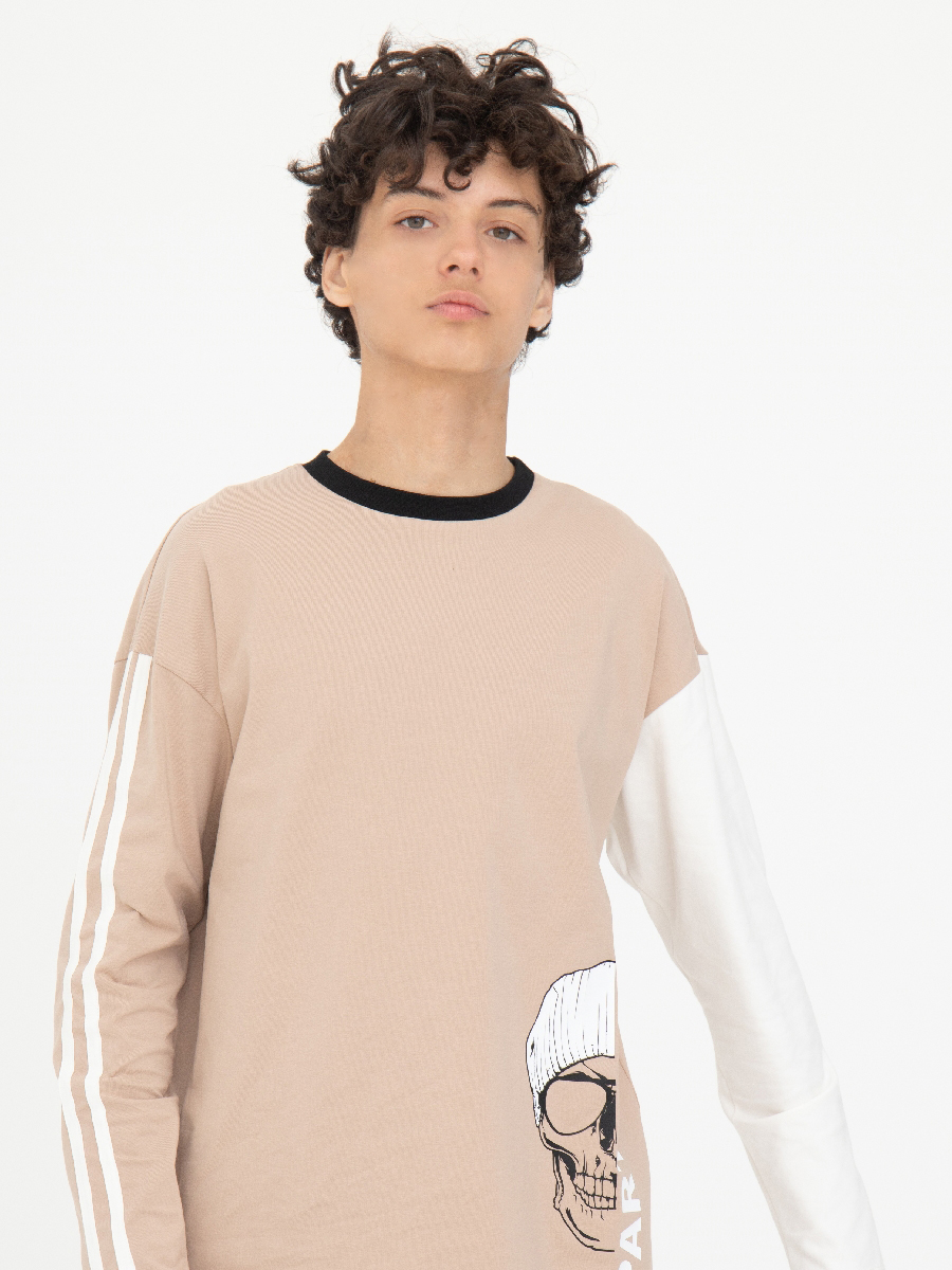 Лонгслив для мальчика прямого силуэта, с длинными втачными рукавами, с круглым вырезом горловины. Изделие выполнено из полотен компаньонов. На правом рукаве 2 лампаса. кэмел