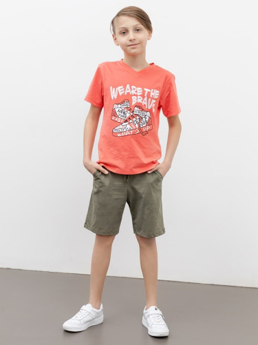 Стильный комплект для мальчиков. Изготовлен из трикотажного футера. Футболка свободного силуэта, длиной до середины бедер, с короткими рукавами и круглой горловиной. Шорты длиной до колена, с эластичной резиной в поясе и регулировочным шнурком. Отличный выбор!