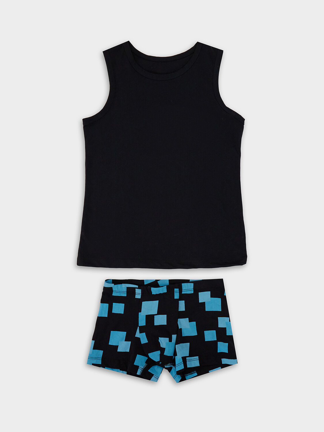 Бельевой комплект для мальчиков, состоящий из нежного и приятного к телу хлопкового полотна. Майка полуприлегающая, с круглым вырезом. Трусы-боксеры без боковых швов и эластичной тесьмой в поясе. Рекомендуем!
