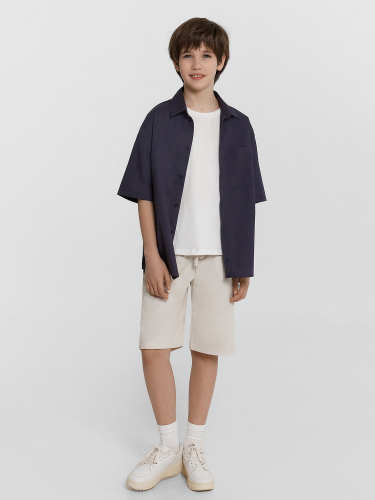 Рубашка для мальчиков прямого силуэта с воротником. По переду обработана застежка на пуговицу d=10mm и петли. На правой детали переда накладной карман. Рукава короткие, втачные, слегка спущены. Нижние срезы изделия и рукавов обработаны швом в подгибку.