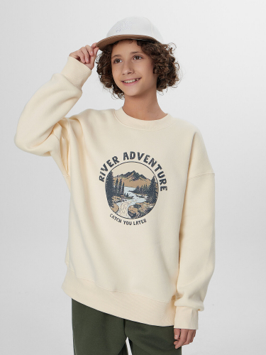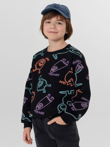 Свитшот свободного силуэта. Рукава длинные, втачные. Линия плеча спущена. По переду декоративное членение. Горловина круглой формы c окантовкой из трикотажного полотна рибаны. Низ рукавов и изделия обработаны трикотажным полотном рибана .
