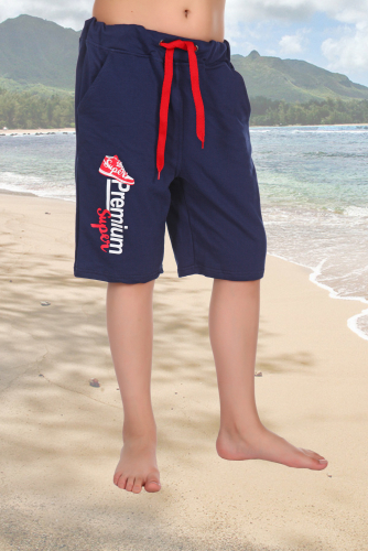 Шорты из футера с лайкрой для мальчиков. Пояс на резинке со шнурком, принт в виде надписи, по бокам карманы, общая длина приблизительно до коленей. Края изделия не обработаны. Четыре расцветки синяя, антрацитовая, фумэ и серый меланж. Размеры от 32 до 40. Есть возможность розничного заказа товара.