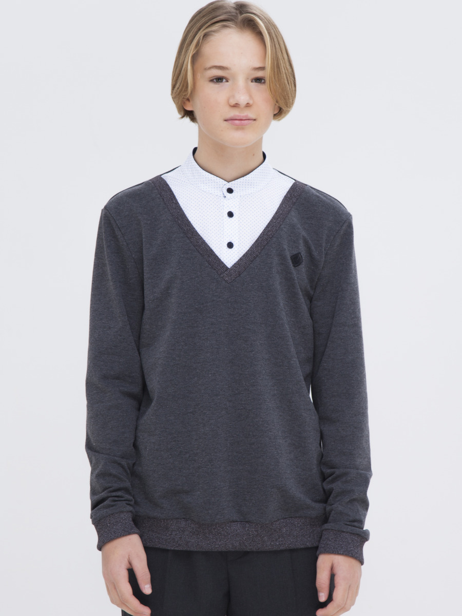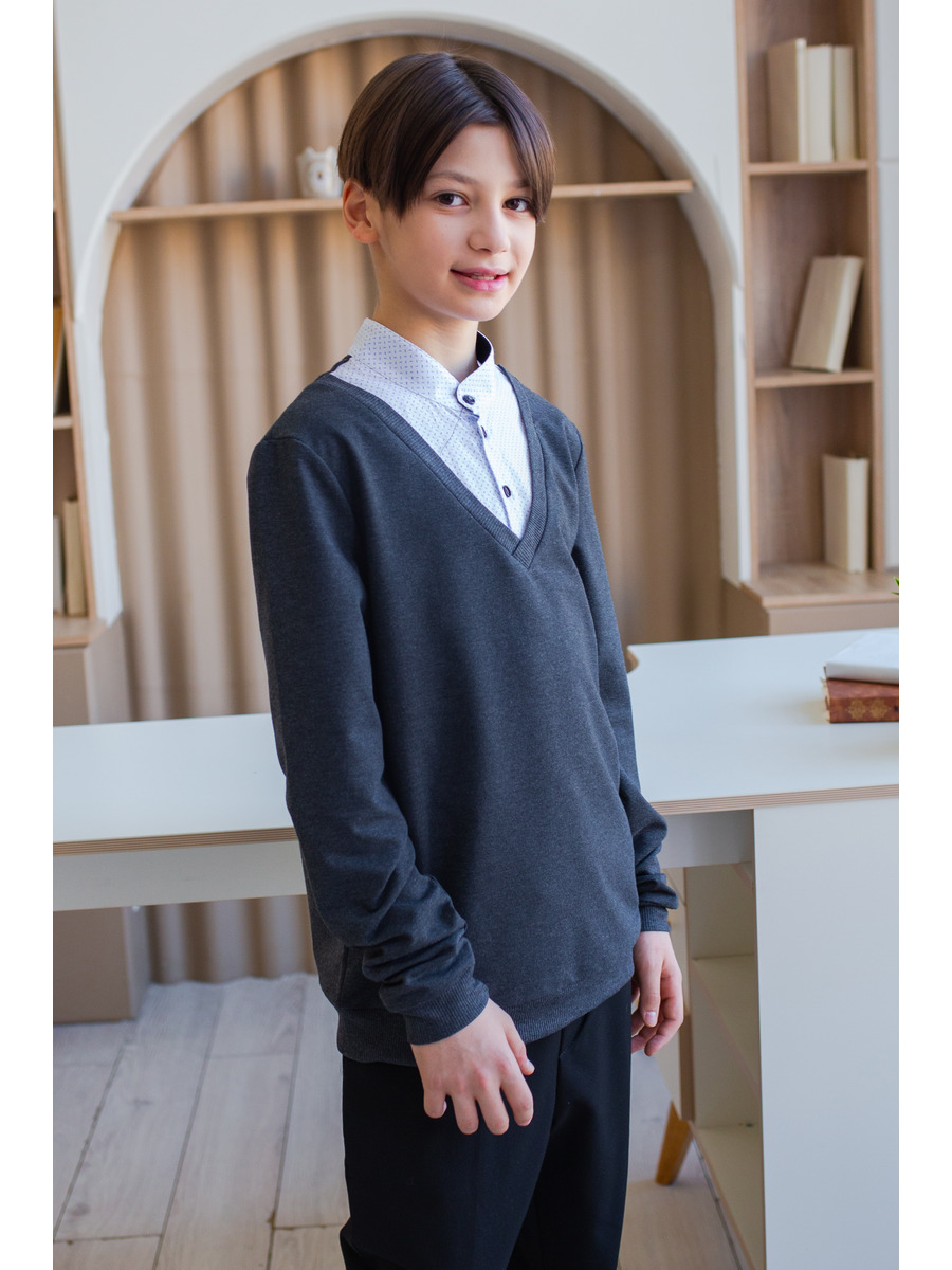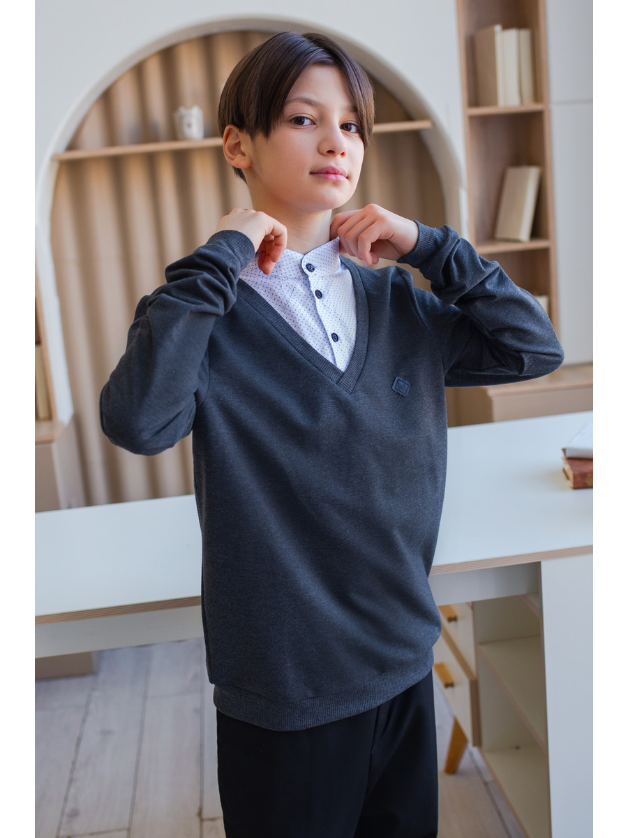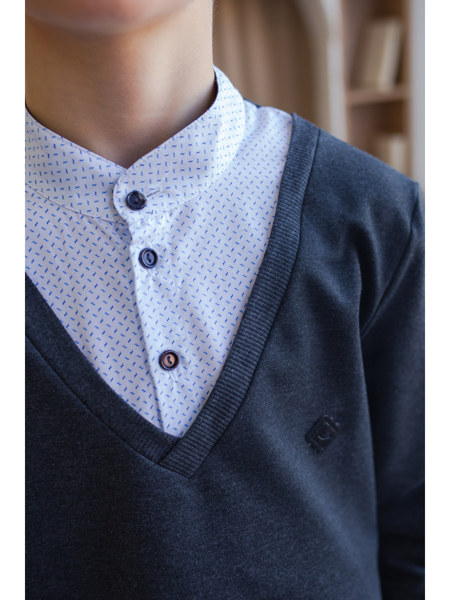 Джемпер-обманка для мальчика из трикотажного полотна и текстиля с длинными рукавами на манжете, прямого силуэта, горловина V-образная с воротником-стойкой из текстиля, застежка на пуговицы.