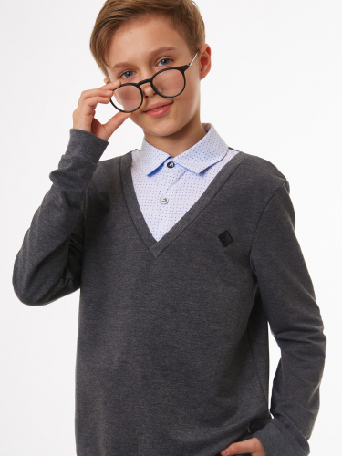 Джемпер-обманка для мальчика из трикотажного полотна и текстиля, прямого силуэта, с длинными втачными рукавами на манжете, с поясом . Горловина V-образная с отложным воротником на стойке из текстиля.