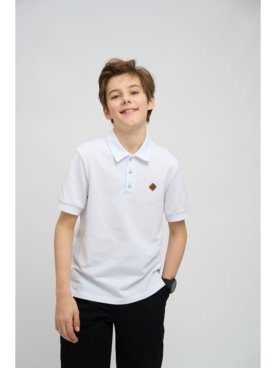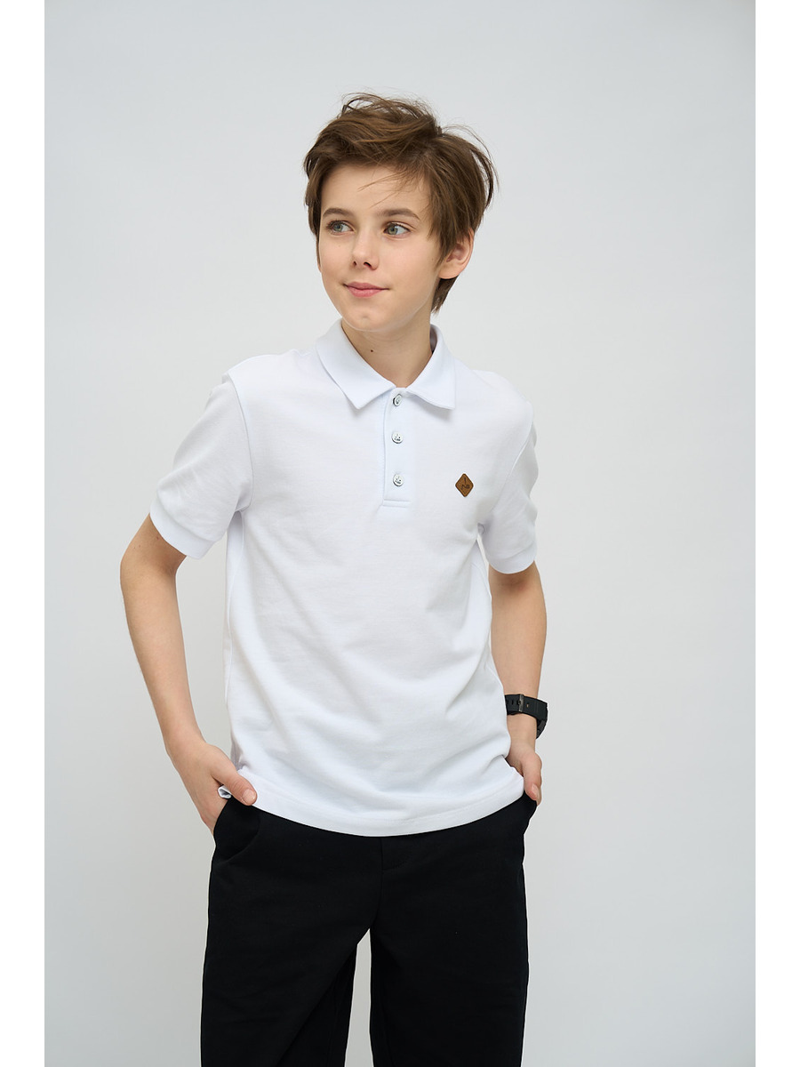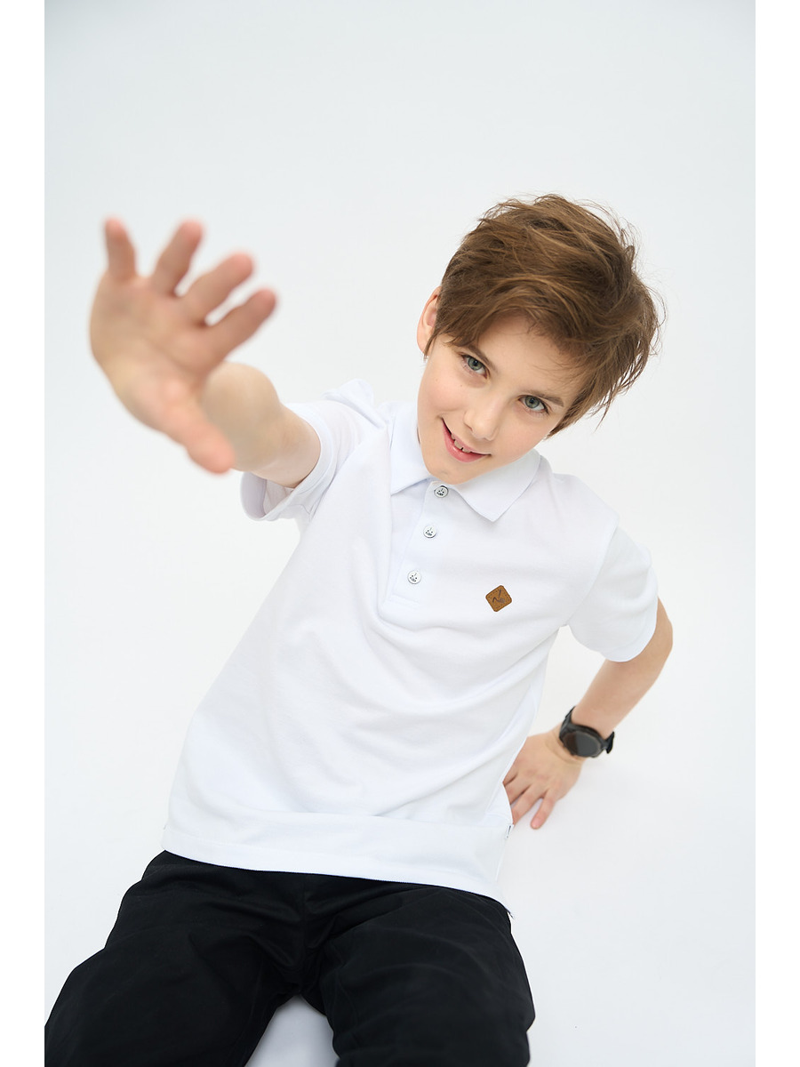 Футболка для мальчика из трикотажного полотна пике прямого силуэта. С отложным воротничком. Украшена маленькой нашивкой на левой полочке. Пуговицы на манишке.