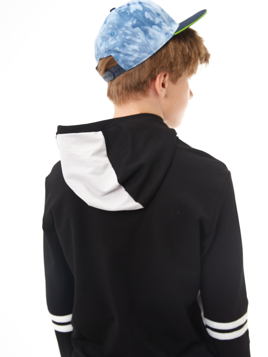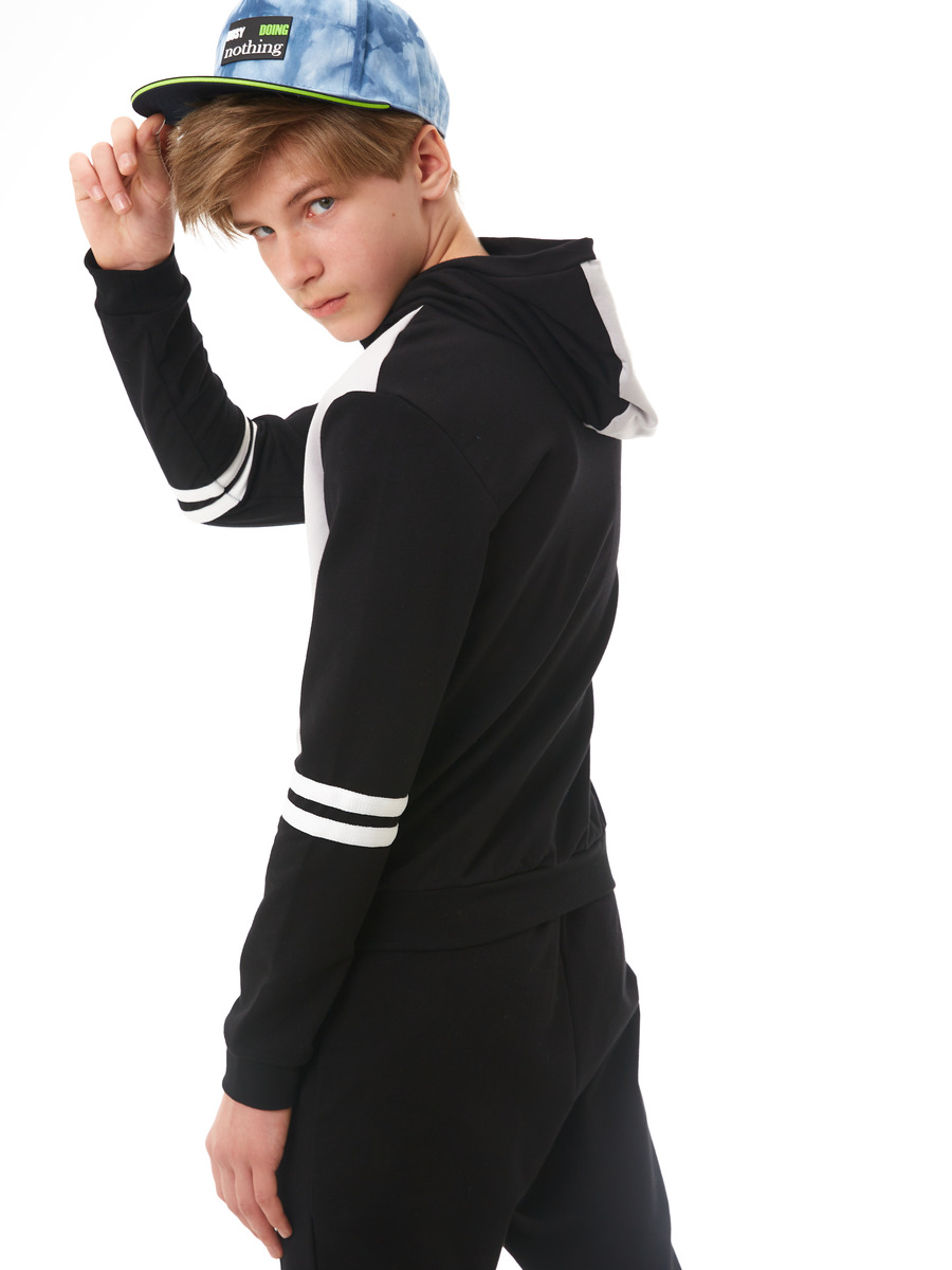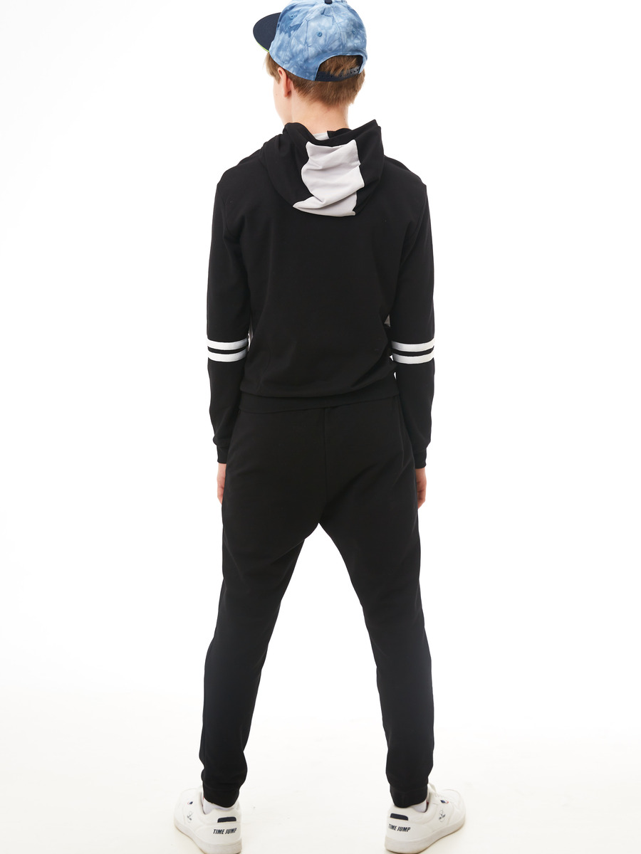 Комплект трикотажный: толстовка с капюшоном и брюки. Толстовка прямого силуэта до середины бедер с длинными втачными рукавами и выполнена из разноконтрастных полотен. На полочку нанесен принт, горловина оформлена капюшоном, по низу рукавов проходят по 2-а ряда настрочного шнура, низ оканчивается притачным поясом. Брюки прямого силуэта, на притачном поясе с эластичной тесьмой и манжетами по низу брючин. В качестве дополнительного декора использованы брендовые этикетки и флажки