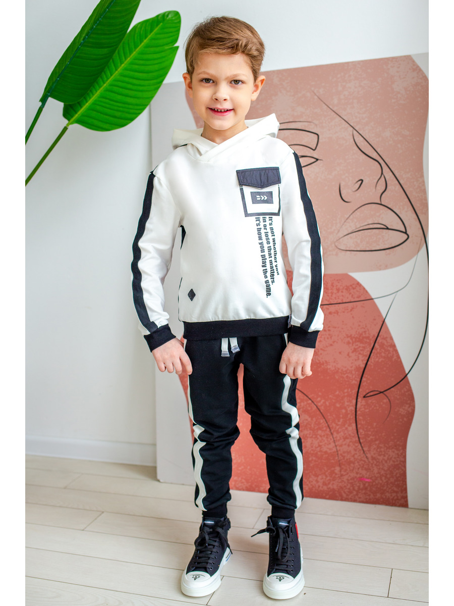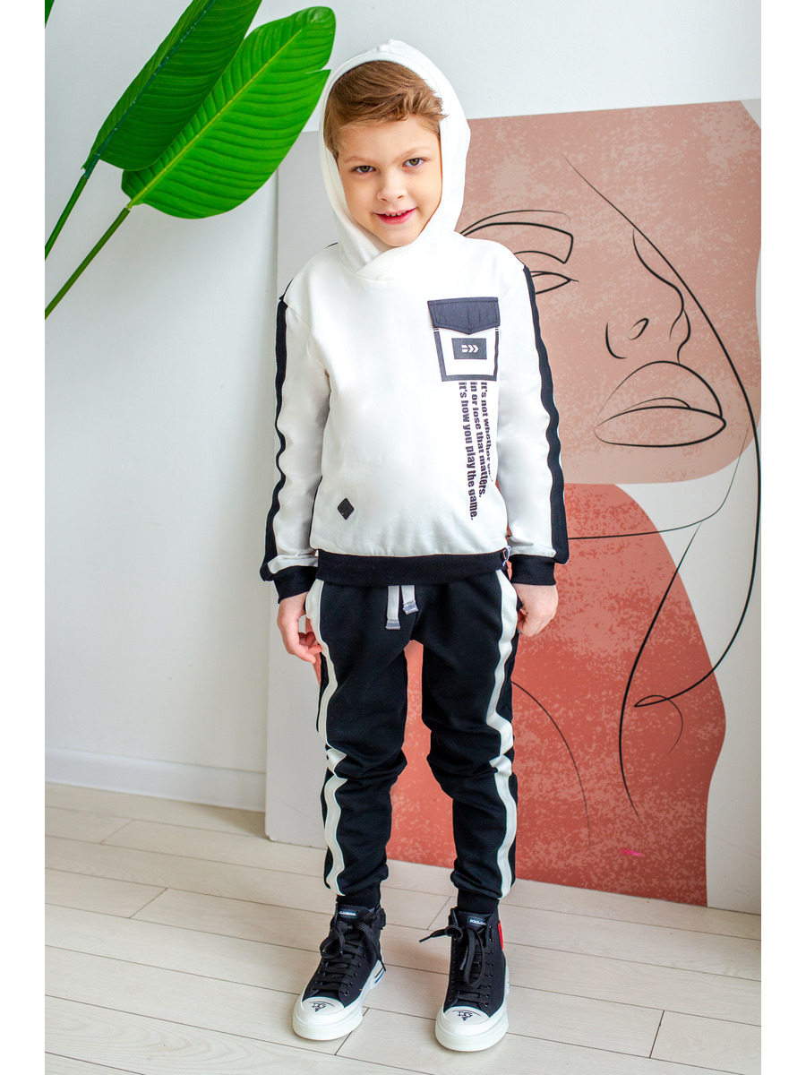 Комплект для мальчика. Тостовка с капюшоном свободного силуэта. На полочке принт. Плечо спущенное, рукав длинный с манжетом по низу, по центру рукава лампас. По низу пояс. Брюки с лампасами прямого силуэта, с карманами в боковых швах. Брюки на поясе с эластичной тесьмой и шнурком внутри. По низу брюк манжеты.
