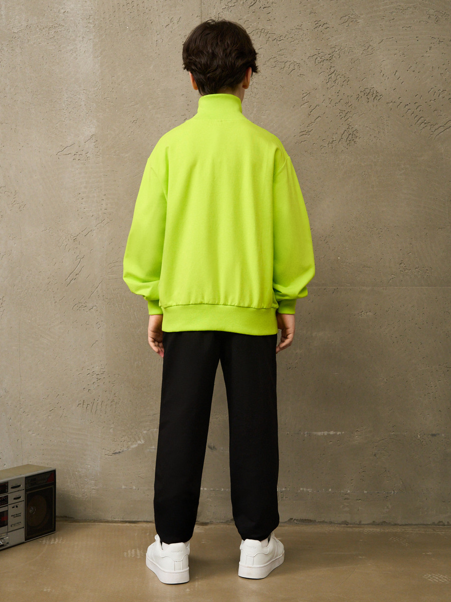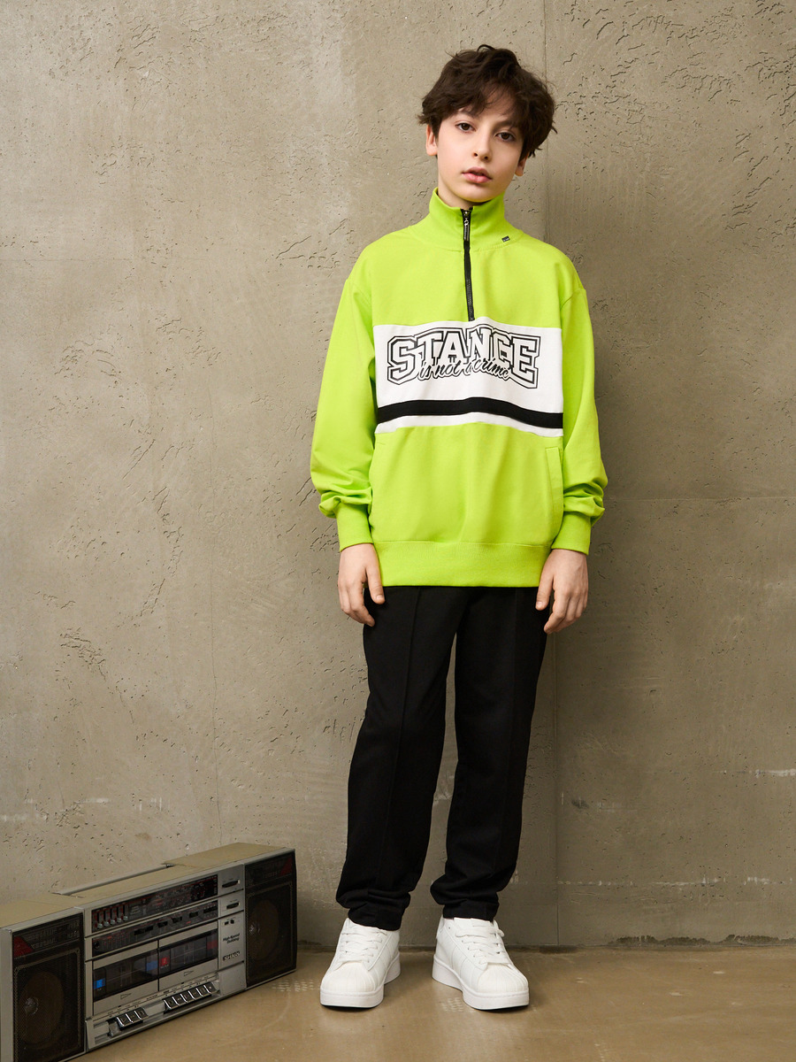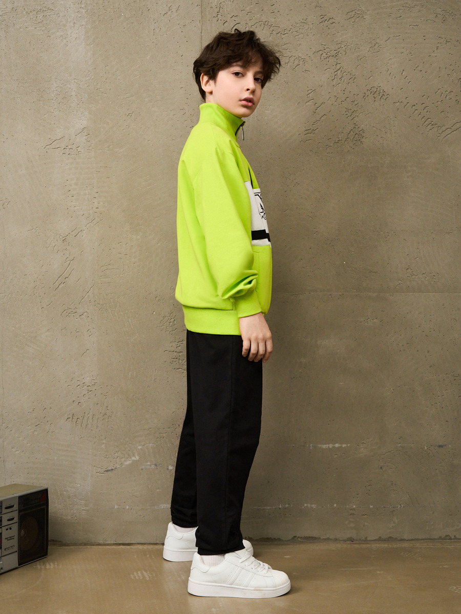 Костюм спортивный для мальчика в винтажном стиле, из премиального качественного хлопкового пенье футера 2-х нитки с лайкрой. Толстовка свободного силуэта, воротник стойка на молнии Халф Зип полузамок, карманы с листочкой. Принт на вставке