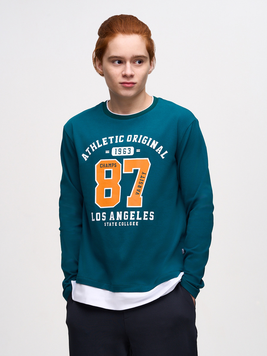 Лонгслив для мальчика их кулирной глади с лайкрой прямого силуэта, оверсайс, спущеное плечо, круглая горловина, иммитация двойного низа. Рукав длинный. Спереди принт.