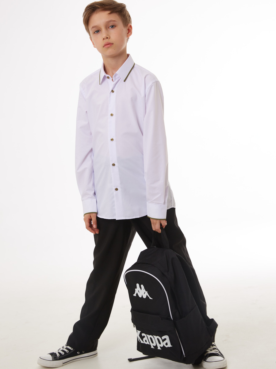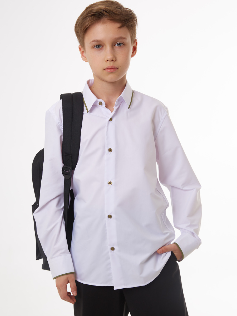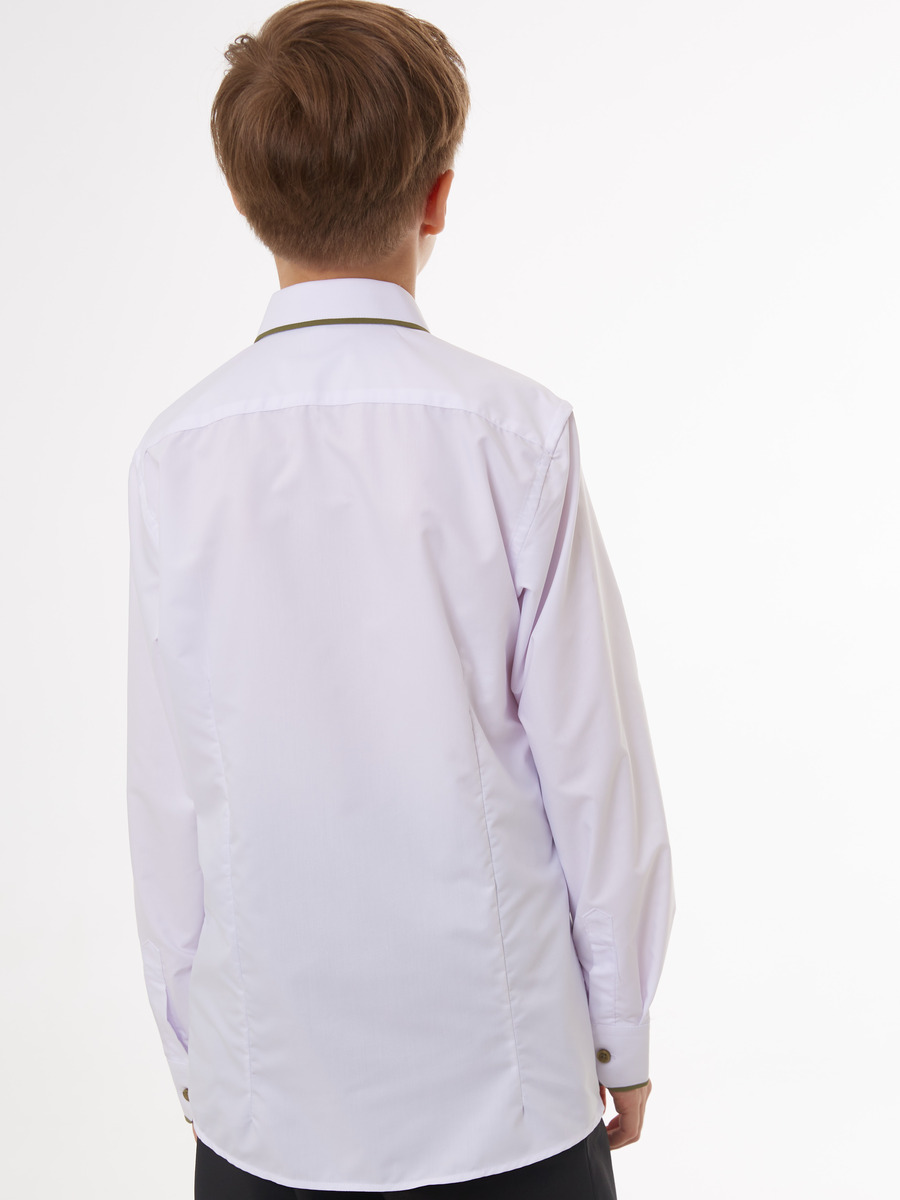 Сорочка приталенного силуэта для мальчика белая с отделкой оливкового цвета