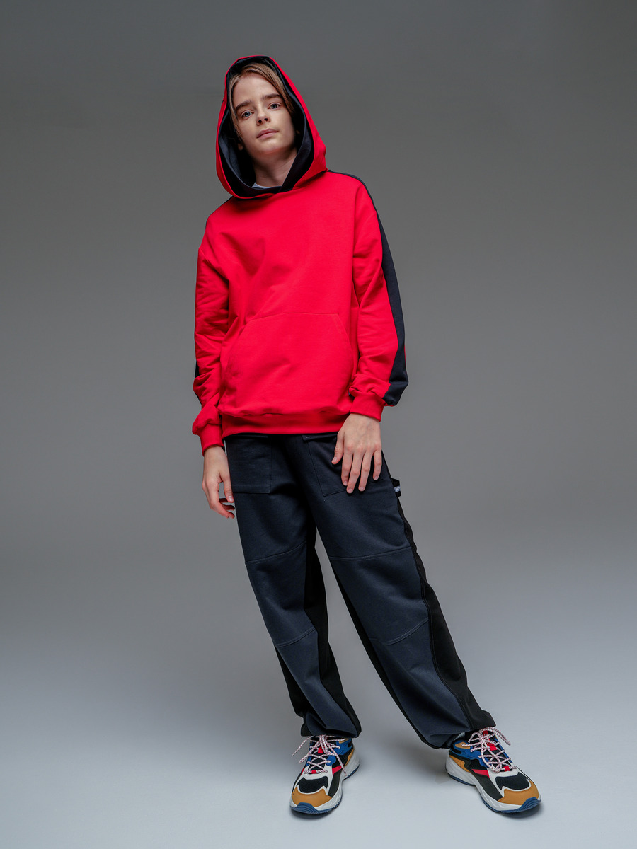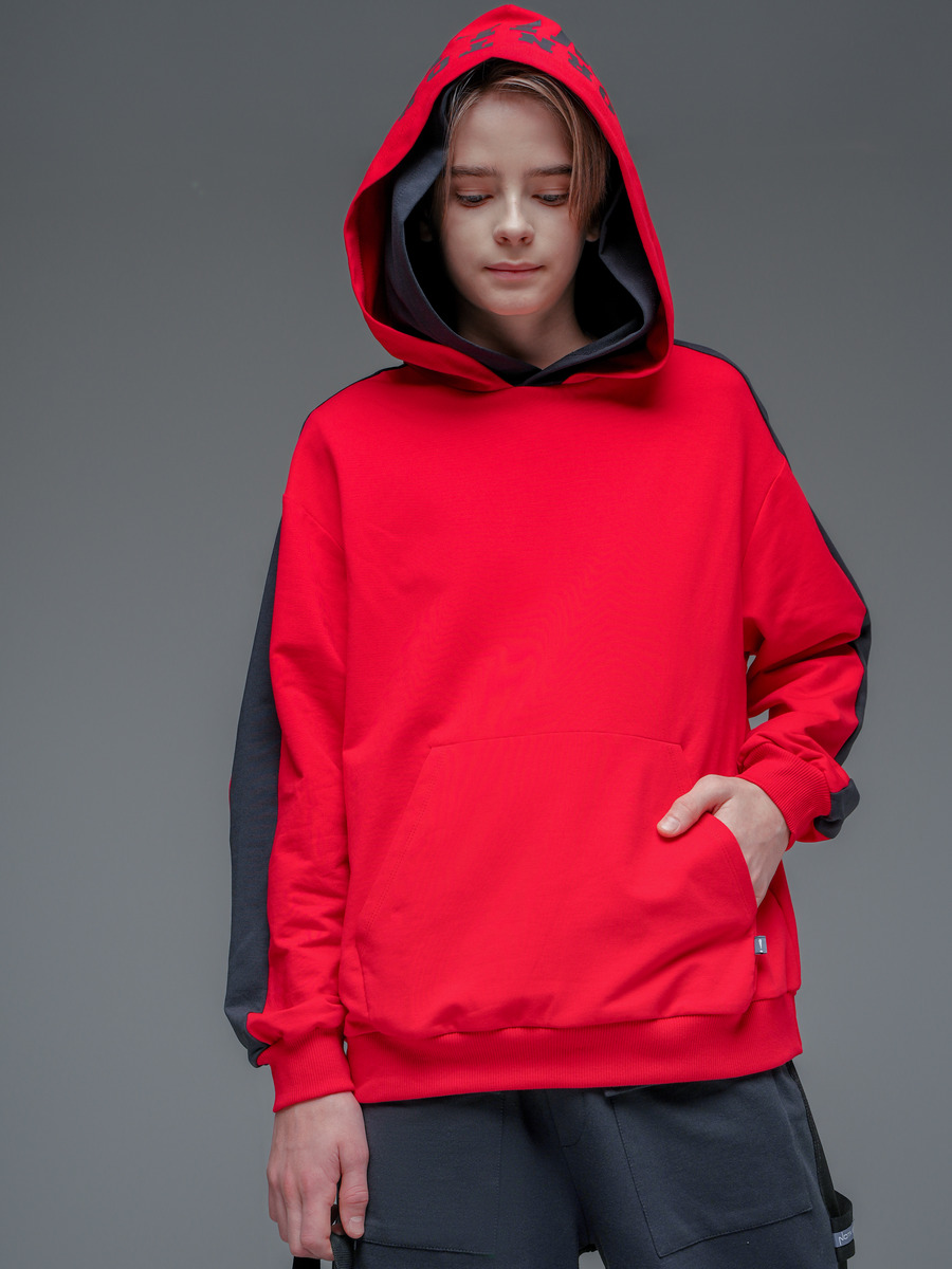 Толстовка для мальчика из премиального качественного хлопкового пенье футера 2-х нитки с лайкрой. Свободного силуэта на поясе, 2-х цветная, с втачным длинным рукавом на манжете, со спущенной линии плеча, карман "кенгуру", круглая горловина, 2 функциональных капюшона для более классного образа на верхнем принт.