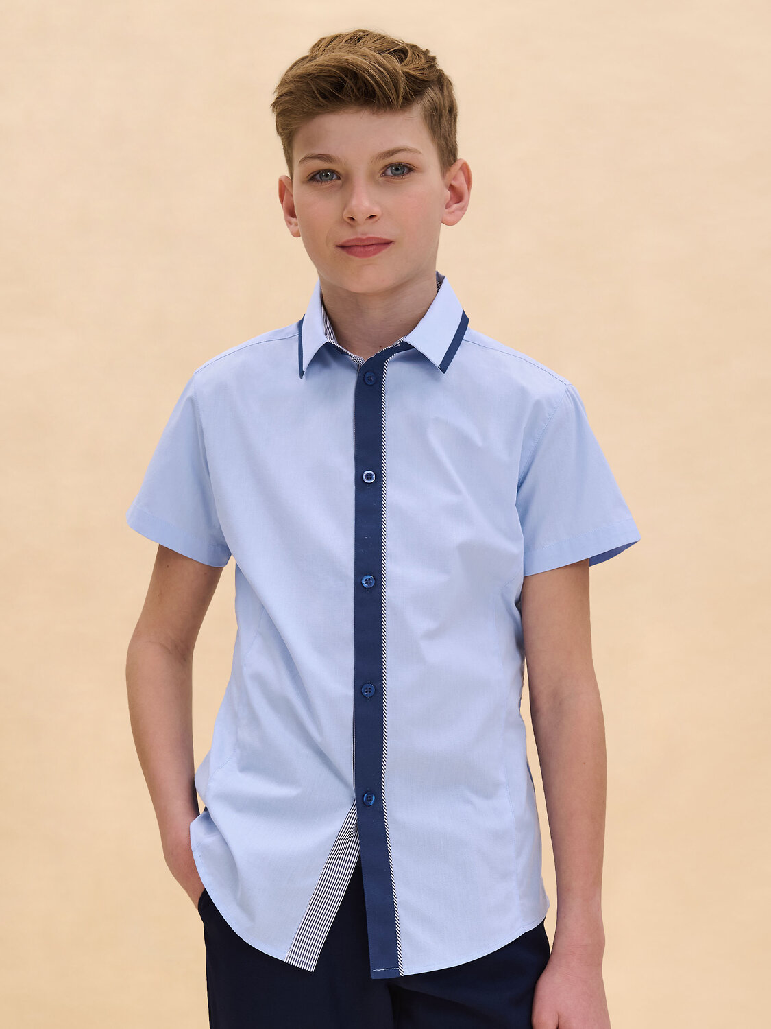 Рубашка для мальчика школьная - остается незаменимой частью гардероба. Детская рубашка представляет собой полуприлегающий силуэт с рельефами от проймы по переду и спинке. Сорочка для мальчика дополнена воротником типа «Виндзор», который позволяет носить её как с классическим галстуком или галстуком-бабочкой, так и без них. Декорирована контрастной отделкой по стойке и внешнему краю воротника, внешней планке. Нижняя планка и декоративный кант вдоль планки выполнены из ткани в полоску, что придает рубашке стильный вид и выгодно отличает её от банальных однотонных моделей. Рубашка для мальчика имеет темный цвет отделки, что позволяет реже стирать изделие. В составе ткани преобладает высококачественный хлопок, который отлично пропускает воздух, давая коже дышать и не перегревая ребёнка. Полиэстер же обеспечивает сохранность формы изделия. Для школьных рубашек мы используем сорочечную ткань, плотностью 100 гр/м2. В ассортименте представлена рубашка на мальчика в синем, белом и голубом цвете, которые легко сочетаются с любыми брюками, пиджаками и жилетами. Стильная рубашка школьная - прекрасный выбор для повседневной носки в школу и более торжественных случаев. Рекомендуемые инструкции по уходу: стирать при температуре не выше 30 °С, без предварительного замачивания, с изнанки, расправить перед сушкой. Это поможет сохранить качество и цвет на длительное время. Выберите нужный размер, ориентируясь на таблицу размеров на фото. Помните, что цвет товара на экране вашего устройства может отличаться от реального цвета изделия.