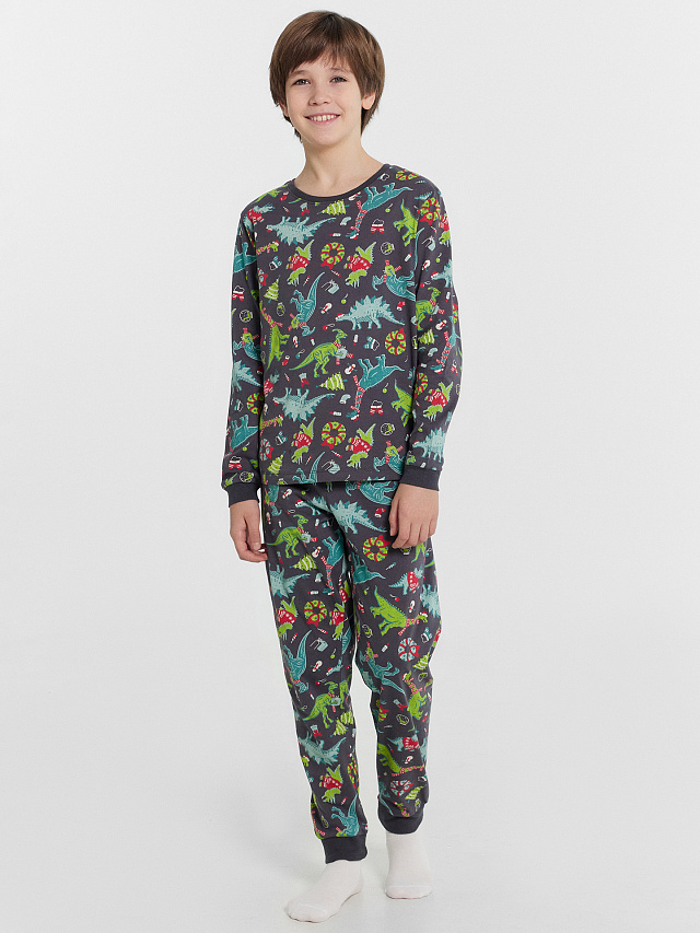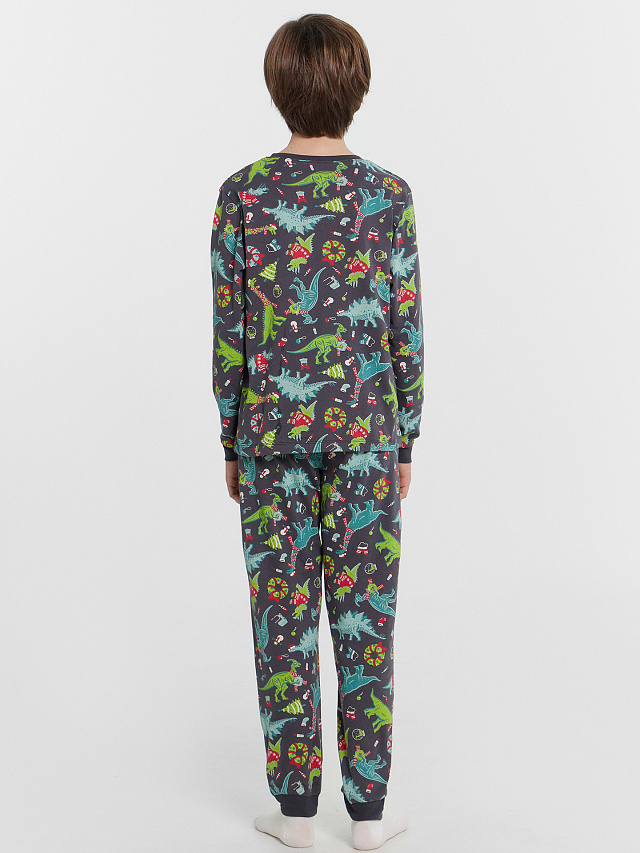 Пижама для мальчиков серая с принтом "новогодние динозавры"