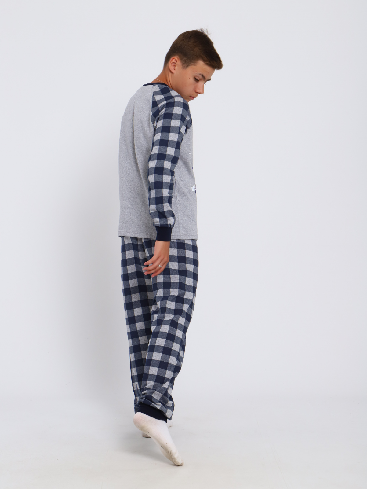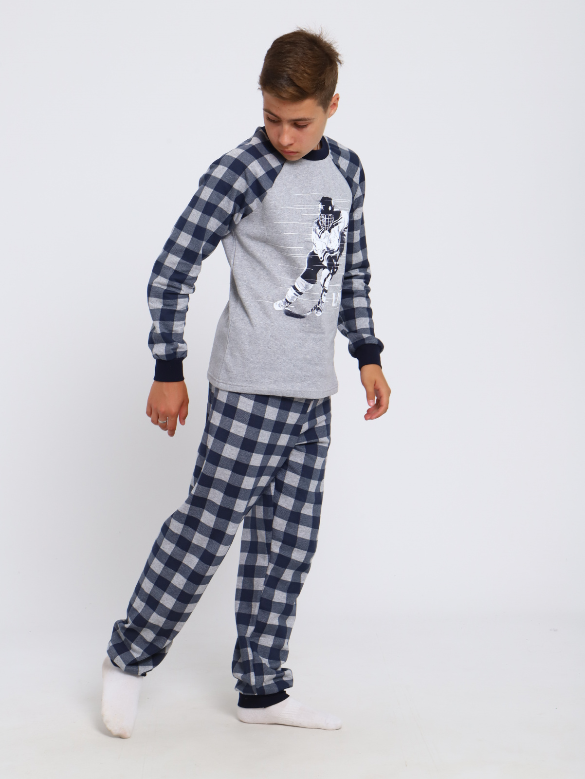 Домашний утепленный комплект для мальчиков со спортивным принтом «хоккеист» из натурального хлопкого материала с небольшим начесом. Костюм для дома может использоваться как домашняя одежда и в качестве пижамы для сна и отдыха. Комплект состоит из кофты с длинным рукавом с комбинированным принтом и штанишек в клетку, выплнен в сдержанной серо-синей гамме. Костюм пошит в свободном полуприлегающем стиле, без карманов для полного комфорта ребенка во сне. Штаны в талии легко регулируются при помощи эластичной резинки. Манжеты на рукавах и штанах придают дополнительное удобство при носке. Пижама отлично подойдет для сна, в такой домашней одежде удобно отдыхать, играть, заниматься уроками или домашними делами в любое время года. Качество ткани, принта и пошива пижамы будет радовать своим первоначальным видом несколько сезонов. Теги: пижама теплая, пижама утепленная, пижама с начесом, пижама для девочки, пижама для мальчика, пижама детская, пижама трикотажная, пижама детская для мальчика, пижама для дома, пижама с принтом, пижама для сна, костюм для сна и отдыха, костюм домашний, комплект домашний, комплект для дома, одежда для дома