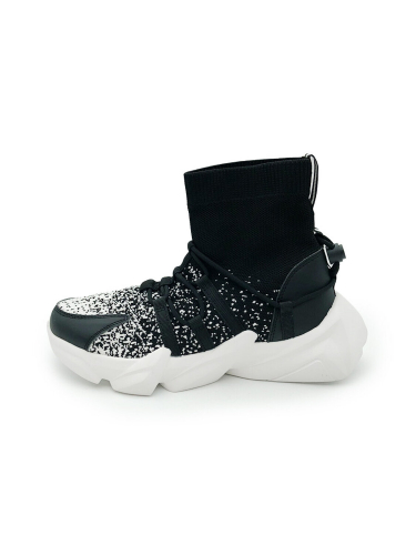 Высокие кроссовки-socks (сокс) для мальчика подростка. Верх - вязаный стрейчевый носок. Носочная и пяточная часть имеет дополнительное усиление. Модель имеет дополнительную фиксацию на стопе с помощью эластичного шнурка с утяжкой. Профилированная стелька из свиной кожи с анатомической формой подсводника обеспечивает правильную нагрузку на стопу. Подошва из ЭВА легкая и гибкая. Колодка очень удобная.