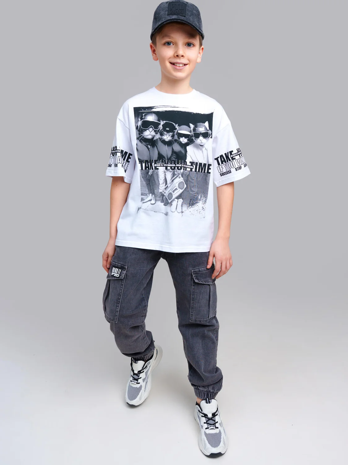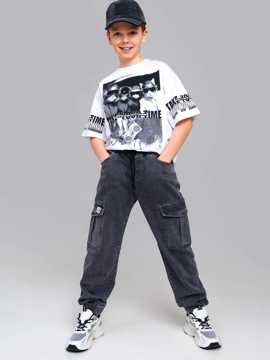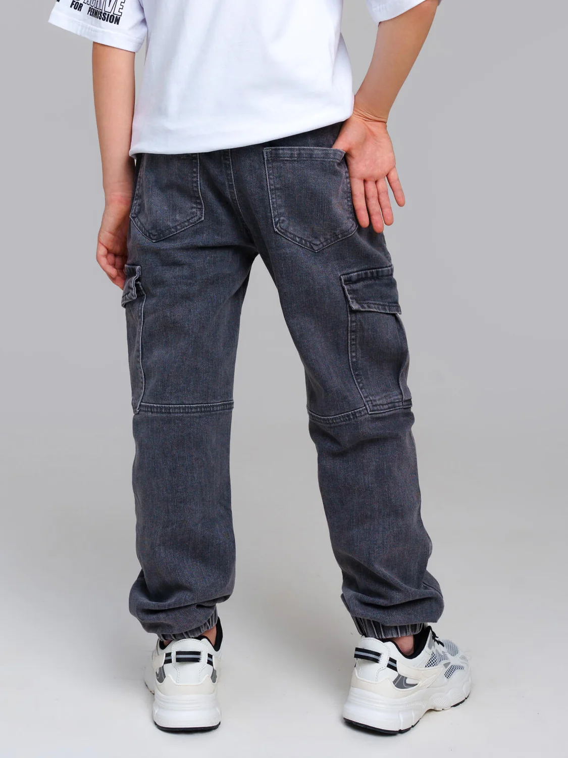 Джоггеры джинсовые для мальчика подростка. Джинсы на резинке со шнурком. Накладные карманы с клапанами на боковых швах. Посадка regular fit – классический крой со слегка зауженным силуэтом от колена. Низ брюк на резинке. Модель выполнена из качественного и плотного текстиля.