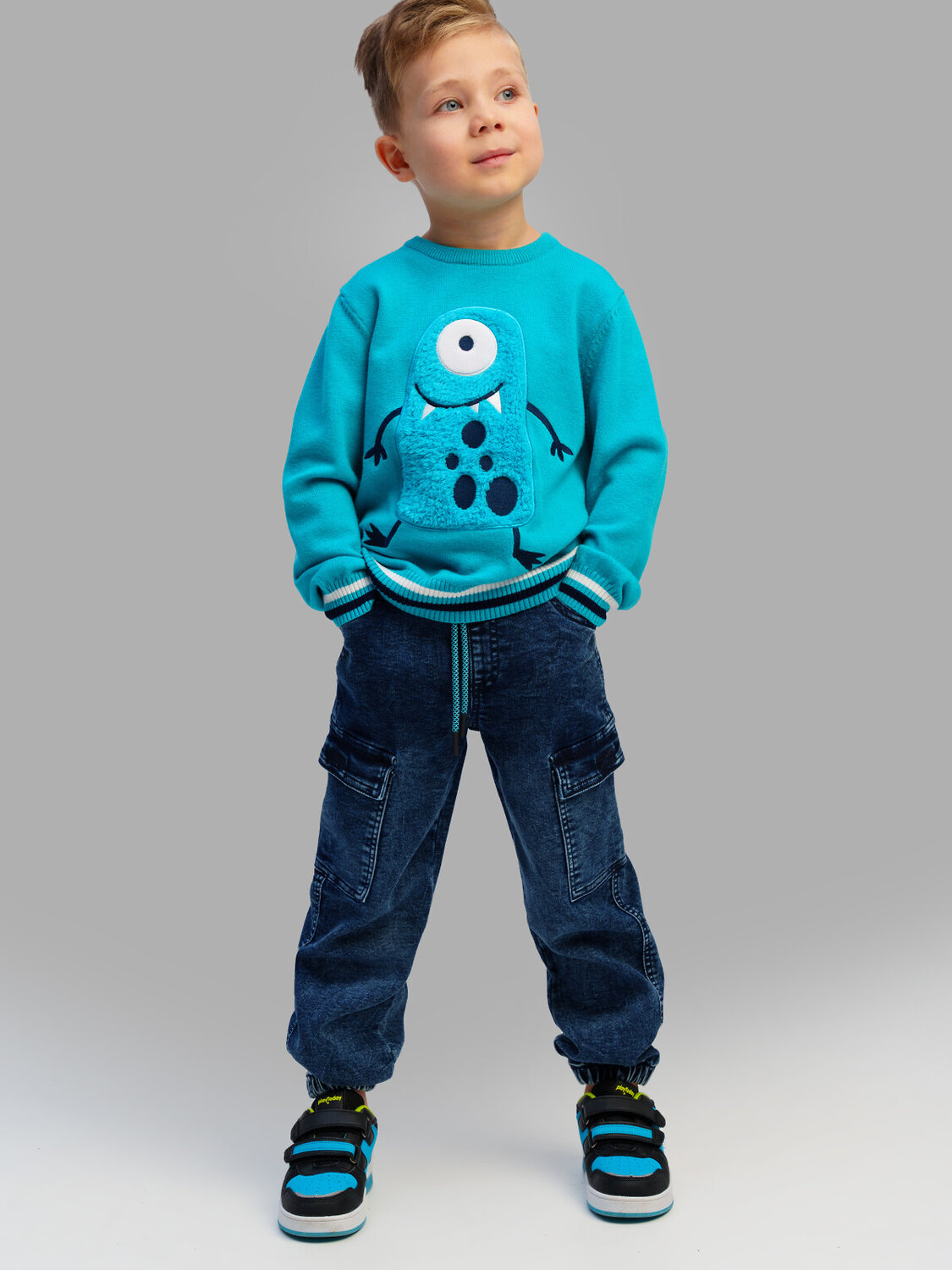 Джинсы детские для мальчика. Джинсы из сверхудобного эластичного материала Loop Denim. Loop denim имеет внешний вид классической джинсы, а по тактильным ощущениям мягкий и комфортный, как трикотаж. JOGGER FIT - спортивный крой. Средняя посадка. Джинсы на резинке со шнурком. Накладные карго-карманы. Модель выполнена из качественного и плотного текстиля.