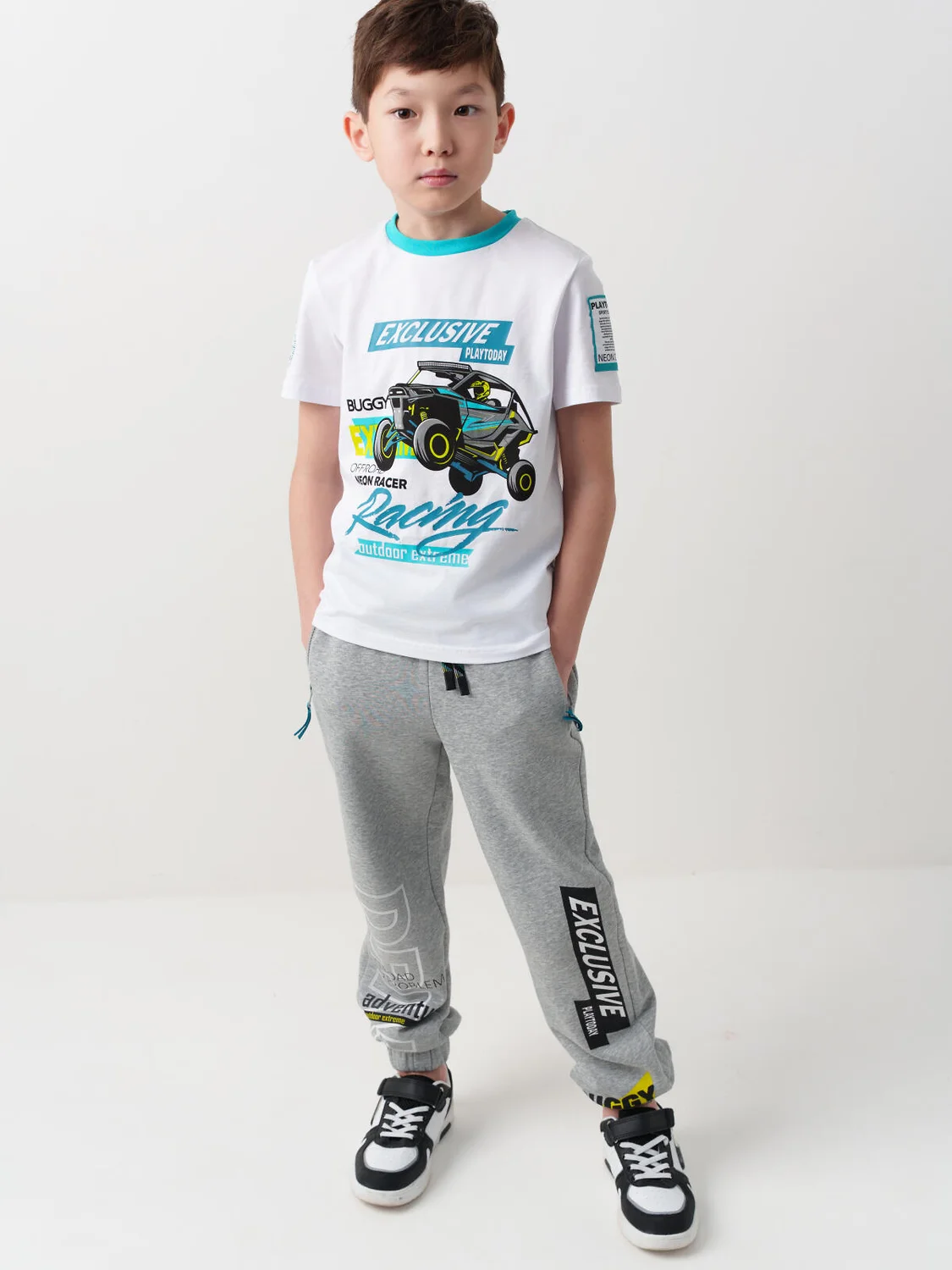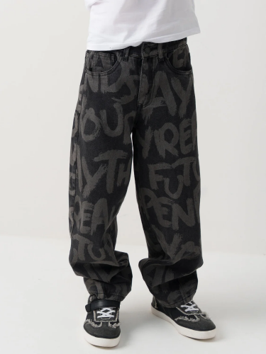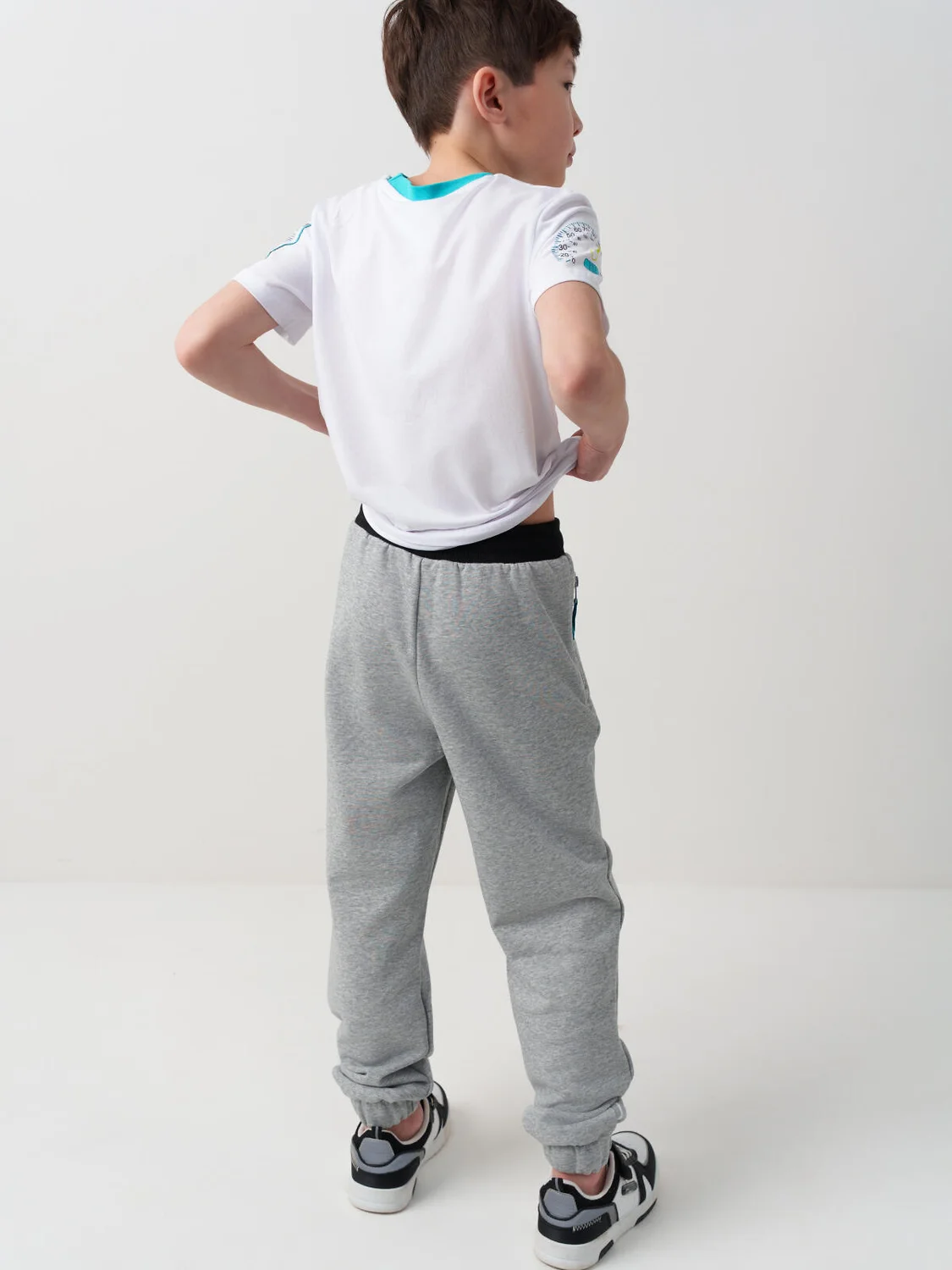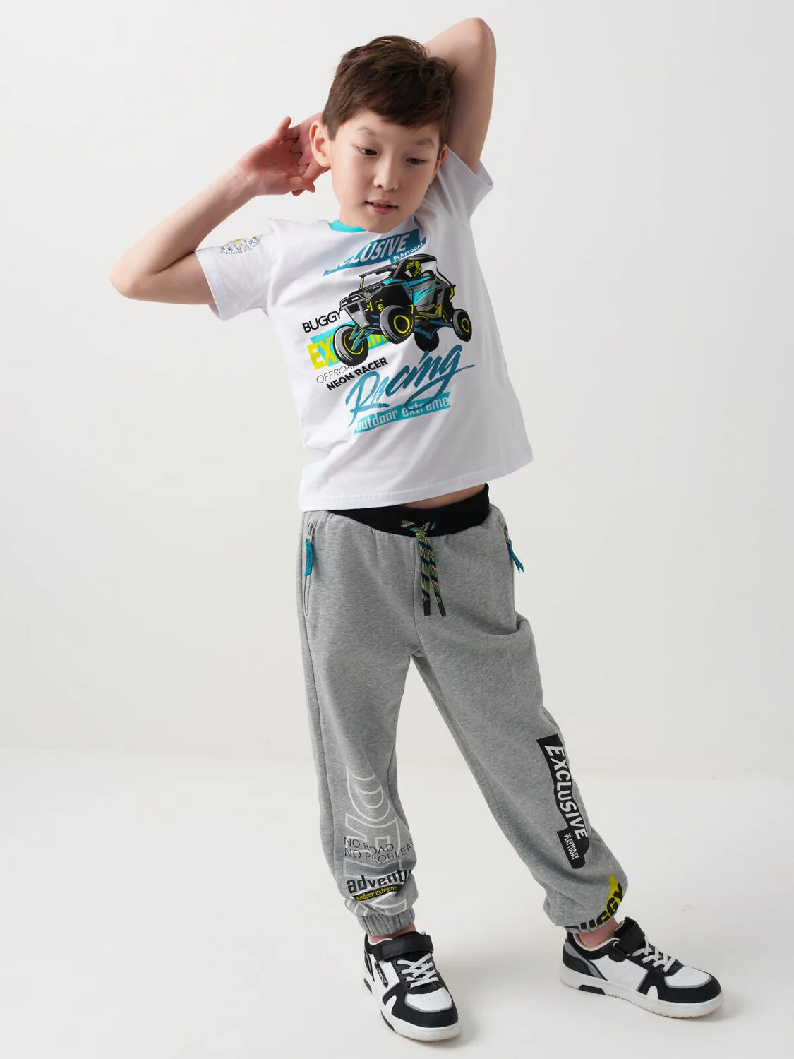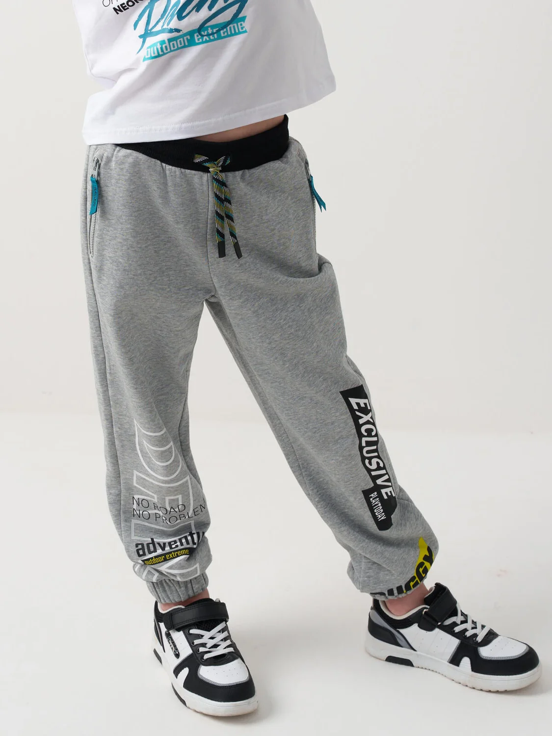 Брюки-джоггеры для мальчика подростка. Модель из хлопкового футера без начеса, средней посадки, со слегка зауженными штанинами и эластичными манжетами внизу. Пояс на резинке, дополнен декоративным шнуром. По бокам расположены два кармана на молниях. Основной цвет — светло-серый с эффектом меланжа. Дизайн украшен крупными надписями и графикой в чёрно-белой гамме с яркими акцентами.