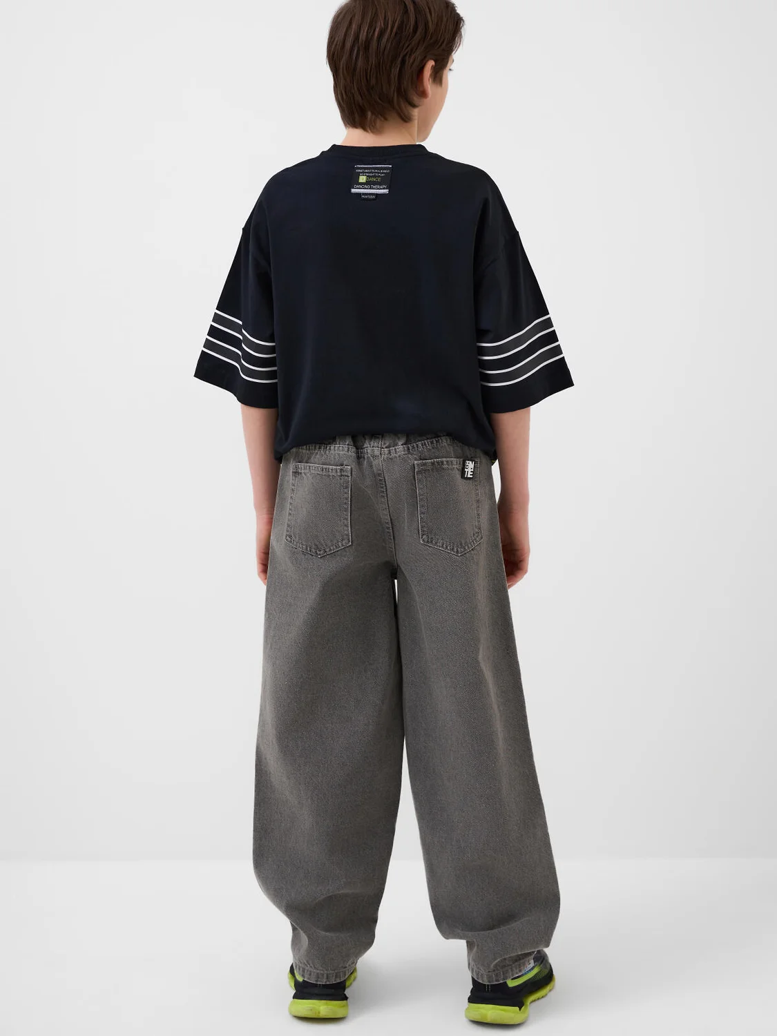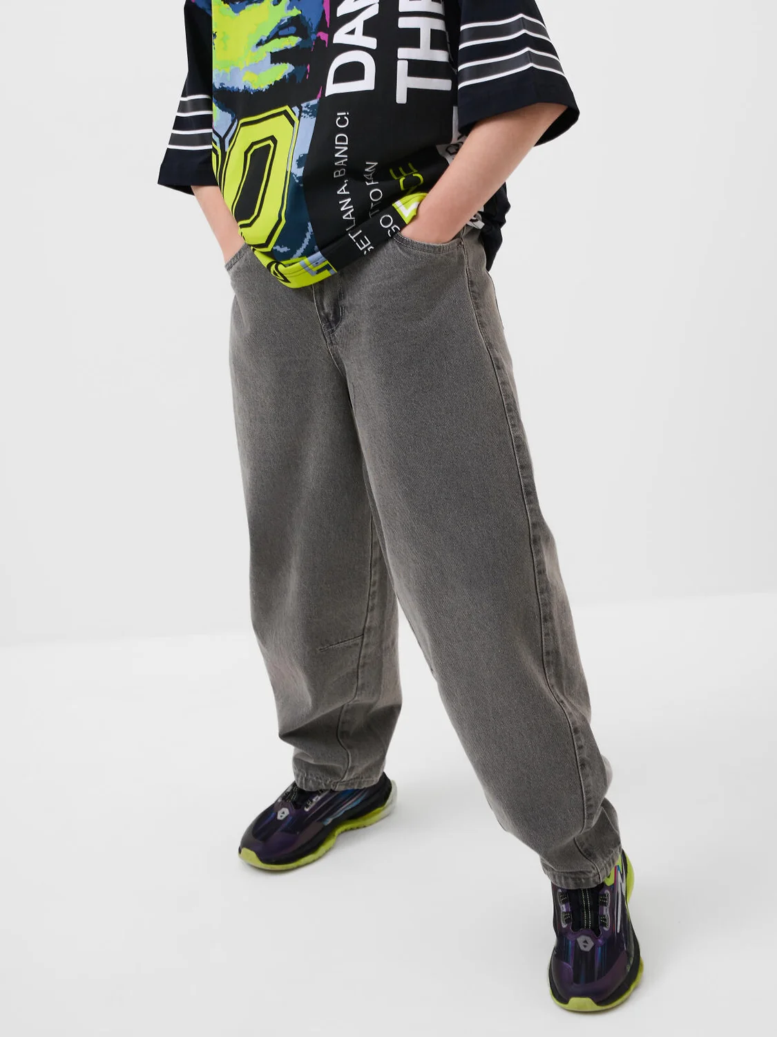 Джинсы для мальчика подростка. Модель прямого силуэта, свободной посадки со слегка укороченной длиной. Сзади пояс собран на резинку, что обеспечивает комфортную посадку. Джинсы выполнены из плотного светло-серого денима. Спереди расположены два классических кармана, сзади – два накладных кармана. Застежка на молнии и кнопку. На заднем кармане — декоративная нашивка с логотипом.