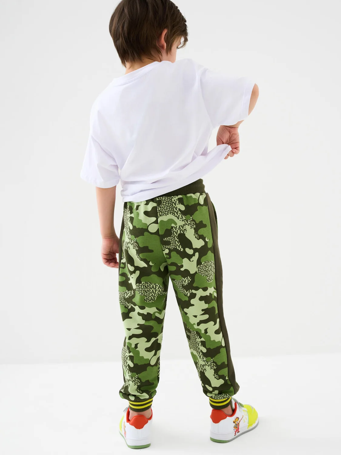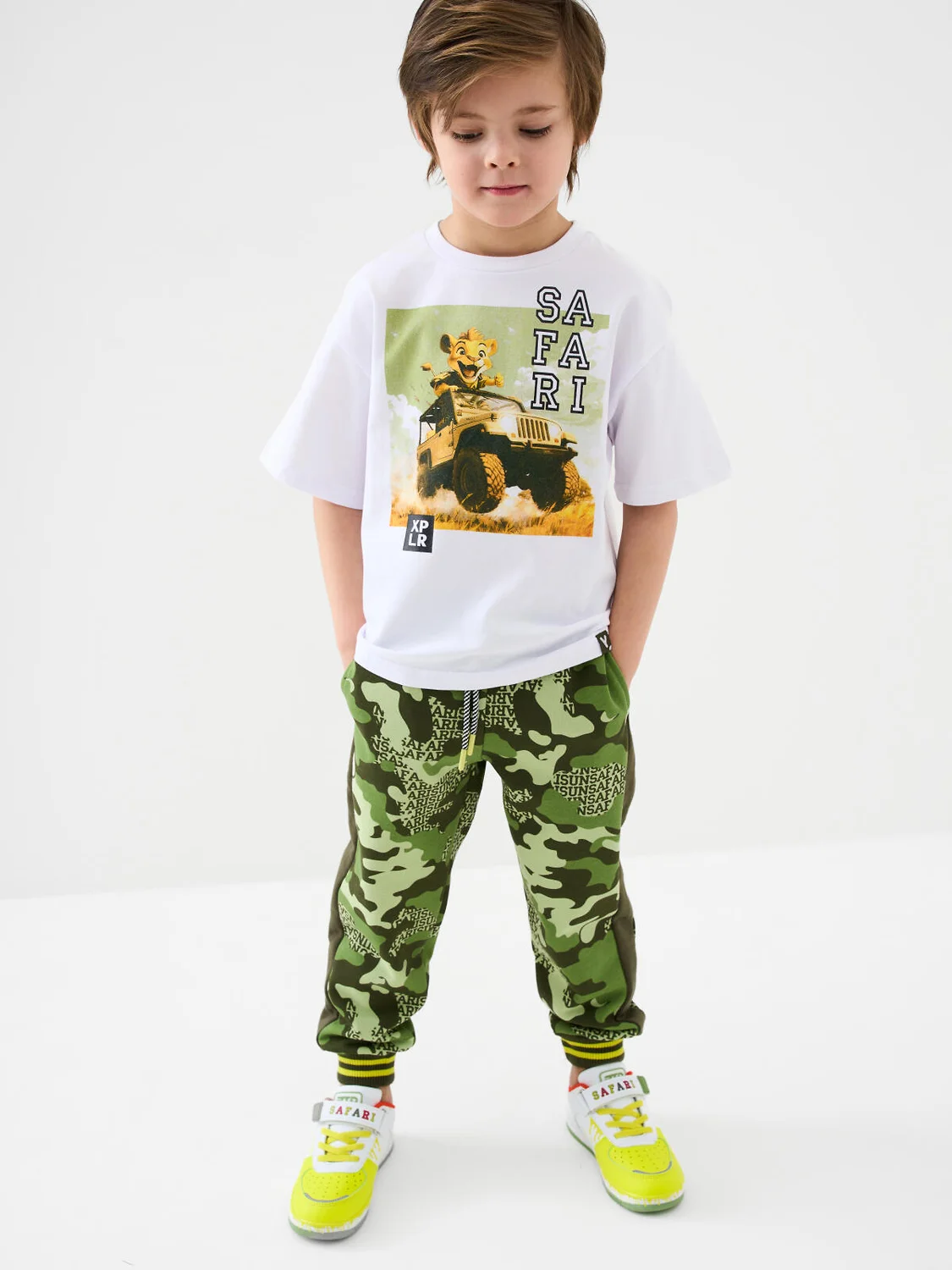 Брюки-джоггеры детские в стиле милитари для мальчика. Выполнены из хлопкового трикотажа футер без начеса. Модель прямого кроя со средней посадкой на талии. Пояс выполнен на резинке, дополнительно регулируется шнурком. По бокам — удобные карманы. В нижней части брючин предусмотрены эластичные трикотажные манжеты для лучшей фиксации.