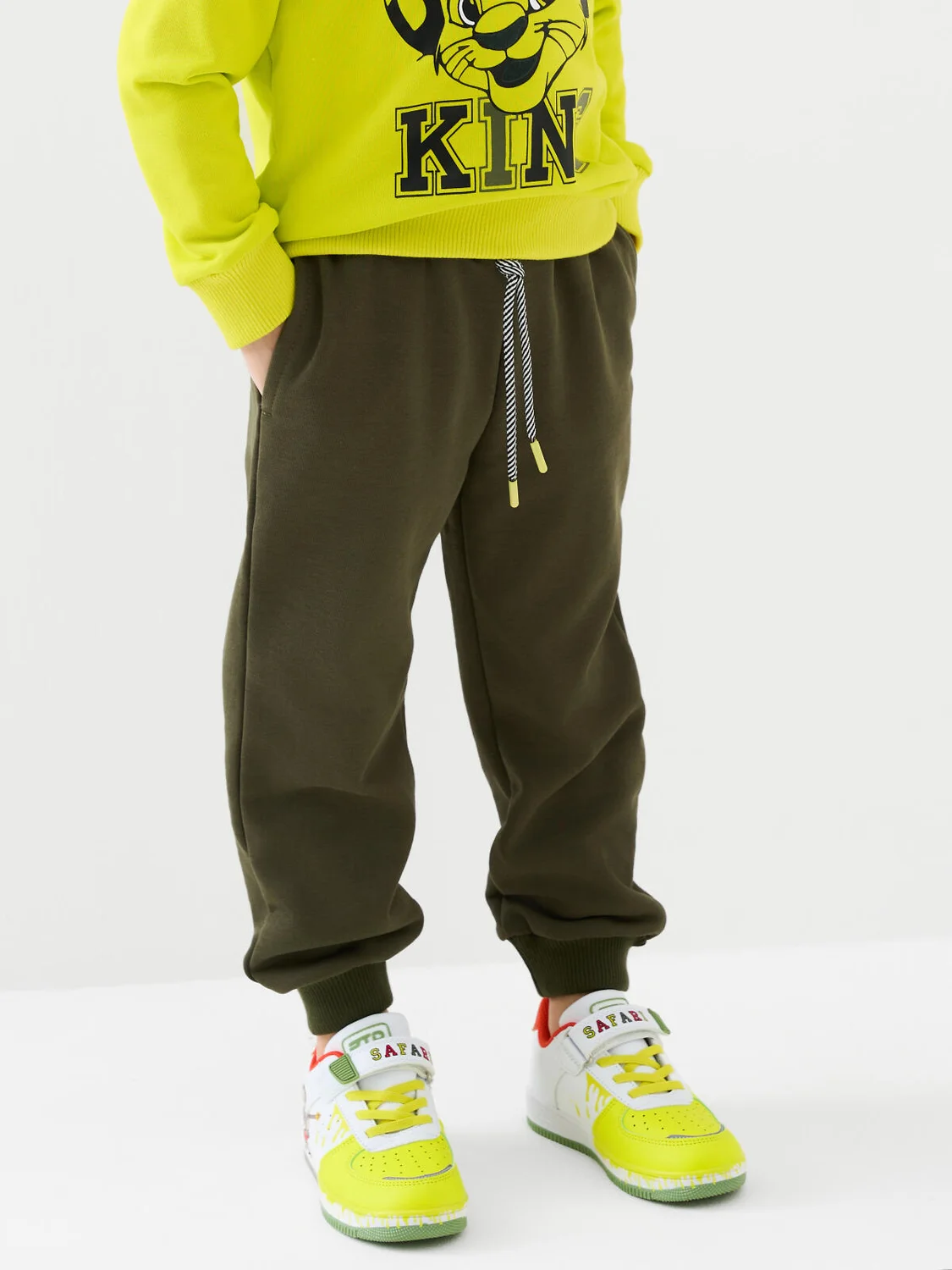 Брюки-джоггеры детские для мальчика. Выполнены из хлопкового трикотажа футер без начеса. Модель прямого кроя со средней посадкой на талии. Пояс выполнен на резинке, дополнительно регулируется шнурком. По бокам — удобные карманы. В нижней части брючин предусмотрены эластичные трикотажные манжеты для лучшей фиксации.