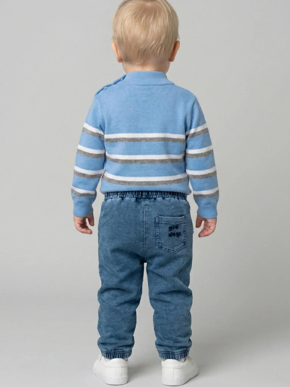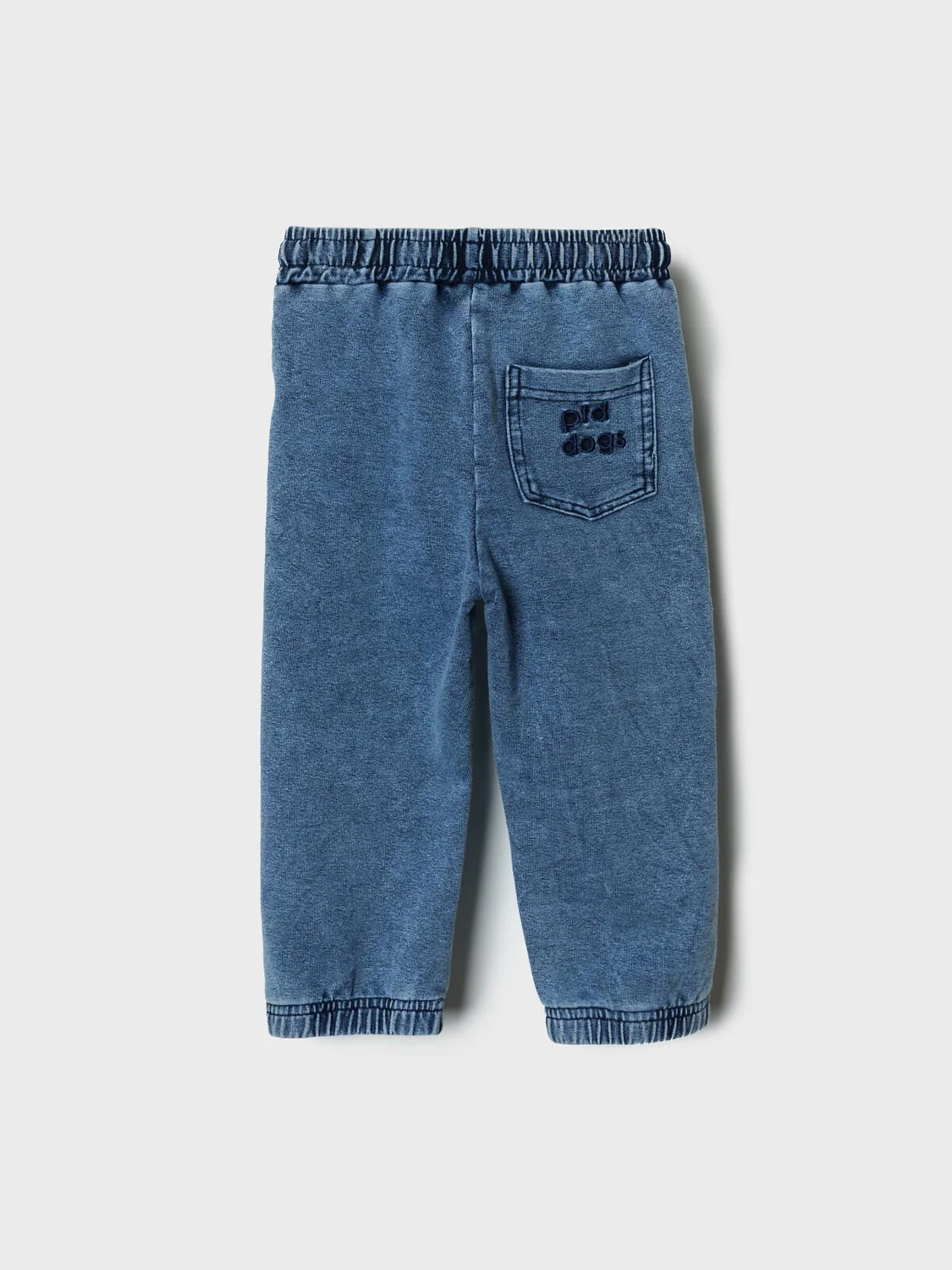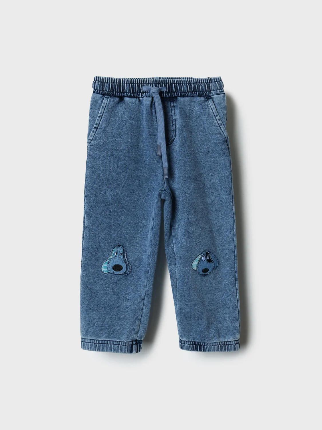 Детские брюки для мальчика. Модель прямого силуэта, выполнена из мягкого хлопкового трикотажа с эффектом денима. У брюк высокий комфортный пояс на широкой резинке и шнурок для регулировки. Спереди — два удобных кармана. Сзади один накладной карман. Декоративные аппликации с милыми собаками. В нижней части брючин предусмотрены эластичные трикотажные манжеты для лучшей посадки.