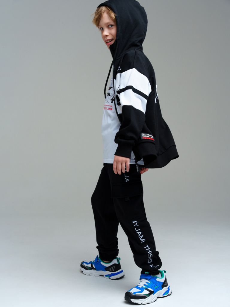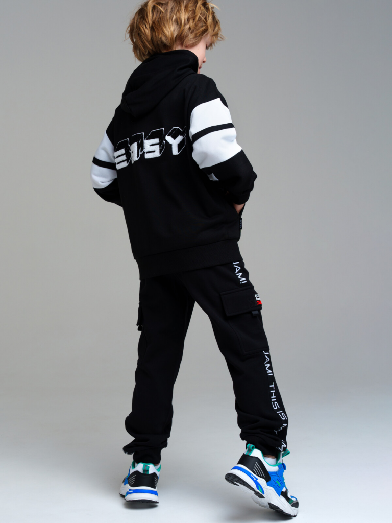 Брюки для мальчика из French Terry. Модель дополнена регулируемым поясом со шнурком. Манжеты по низу брюк в эластичный рубчик. Боковые накладные карманы с клапанами.