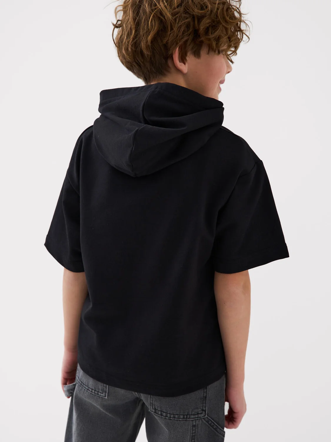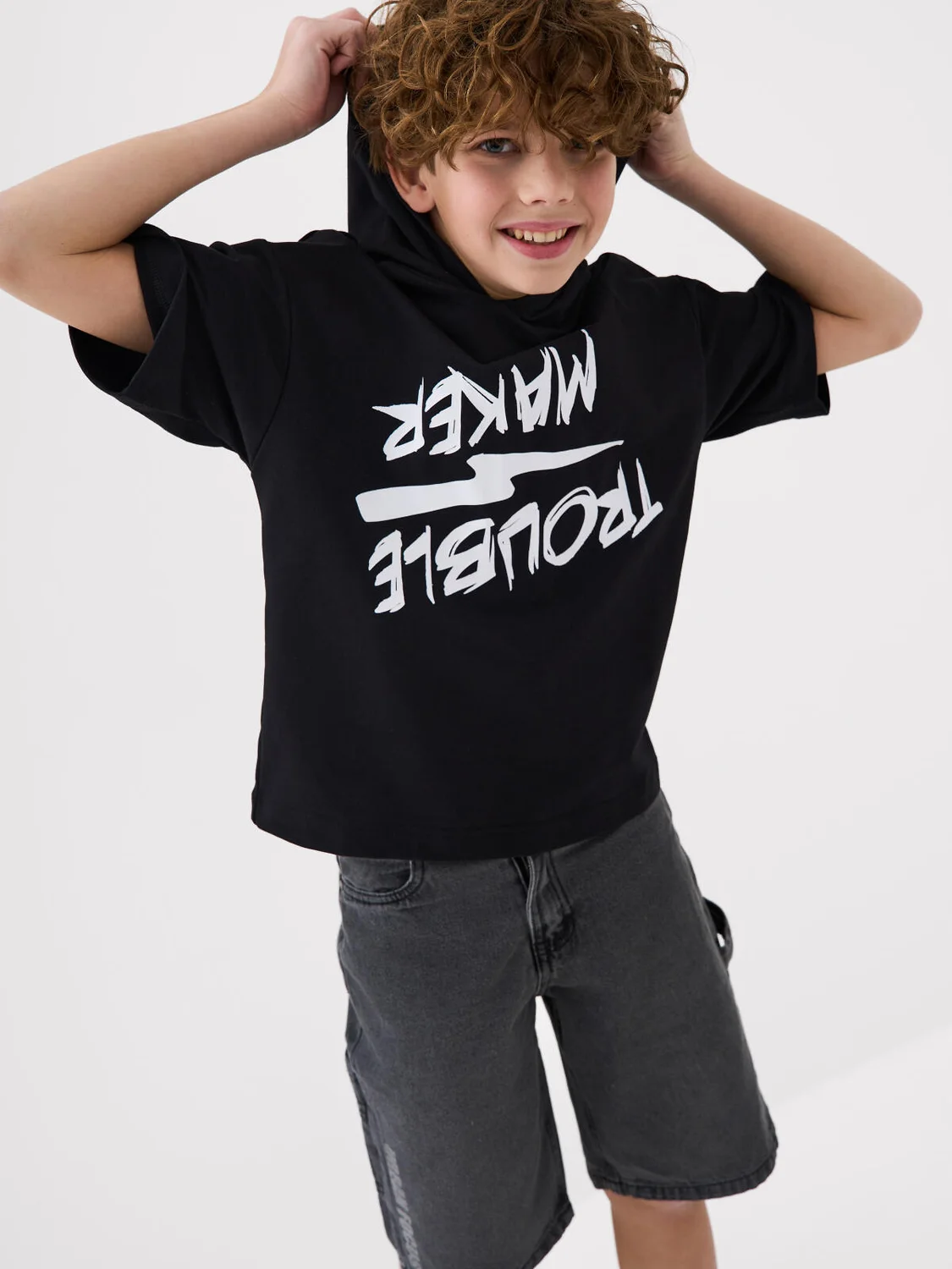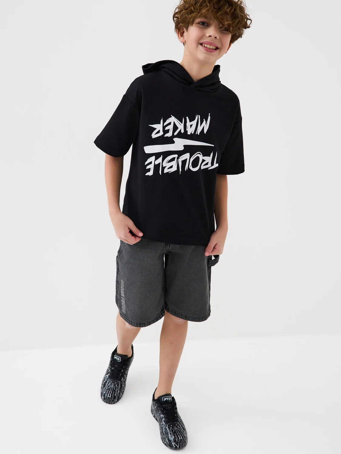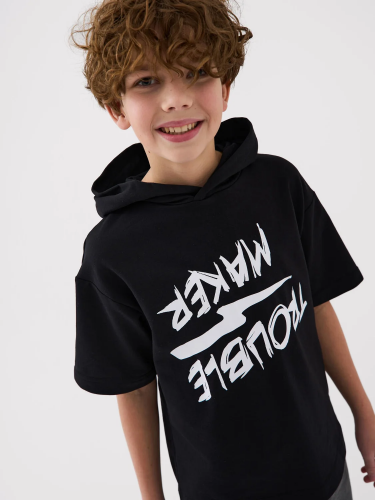 Футболка оверсайз с капюшоном для мальчика подростка. Модель выполнена из эластичного хлопкового трикотажа футер. На груди расположен крупный принт.