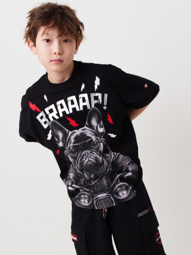 Футболка оверсайз с коротким рукавом для мальчика подростка. Трикотаж с высоким содержанием хлопка. На груди — яркий принт в гоночной тематике с мотоциклом.